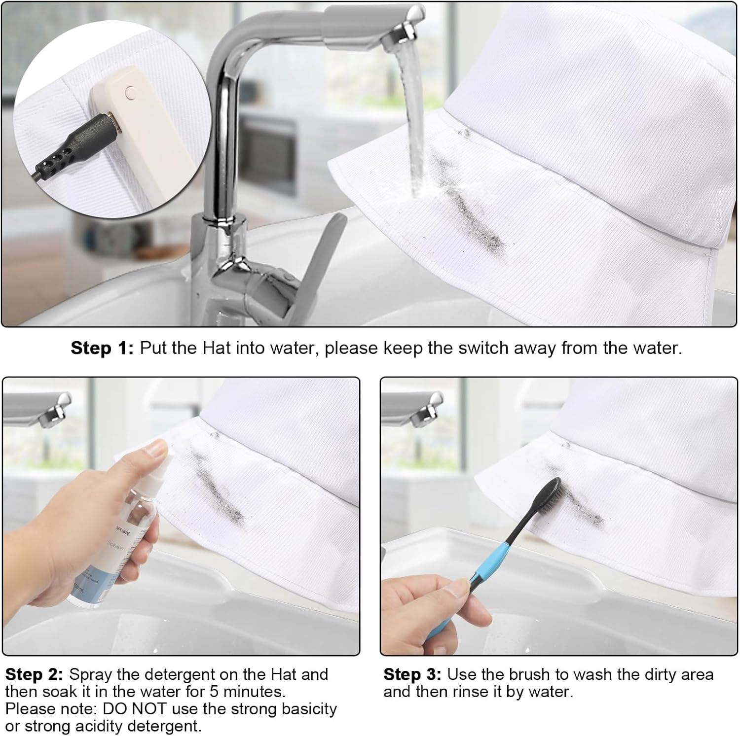 - Hand wash: The LED hat can be gently hand washed (scrub only, can not knead and twist ) with water up to 50 degree centigrade or natural soap, but the battery box must be taken off or keep away from water before washing. Please take off the battery box and please keep the plug of wire away from water. This fabric must not be washed in washing machine. Dryer or iron is forbidden.( Hang dry only).