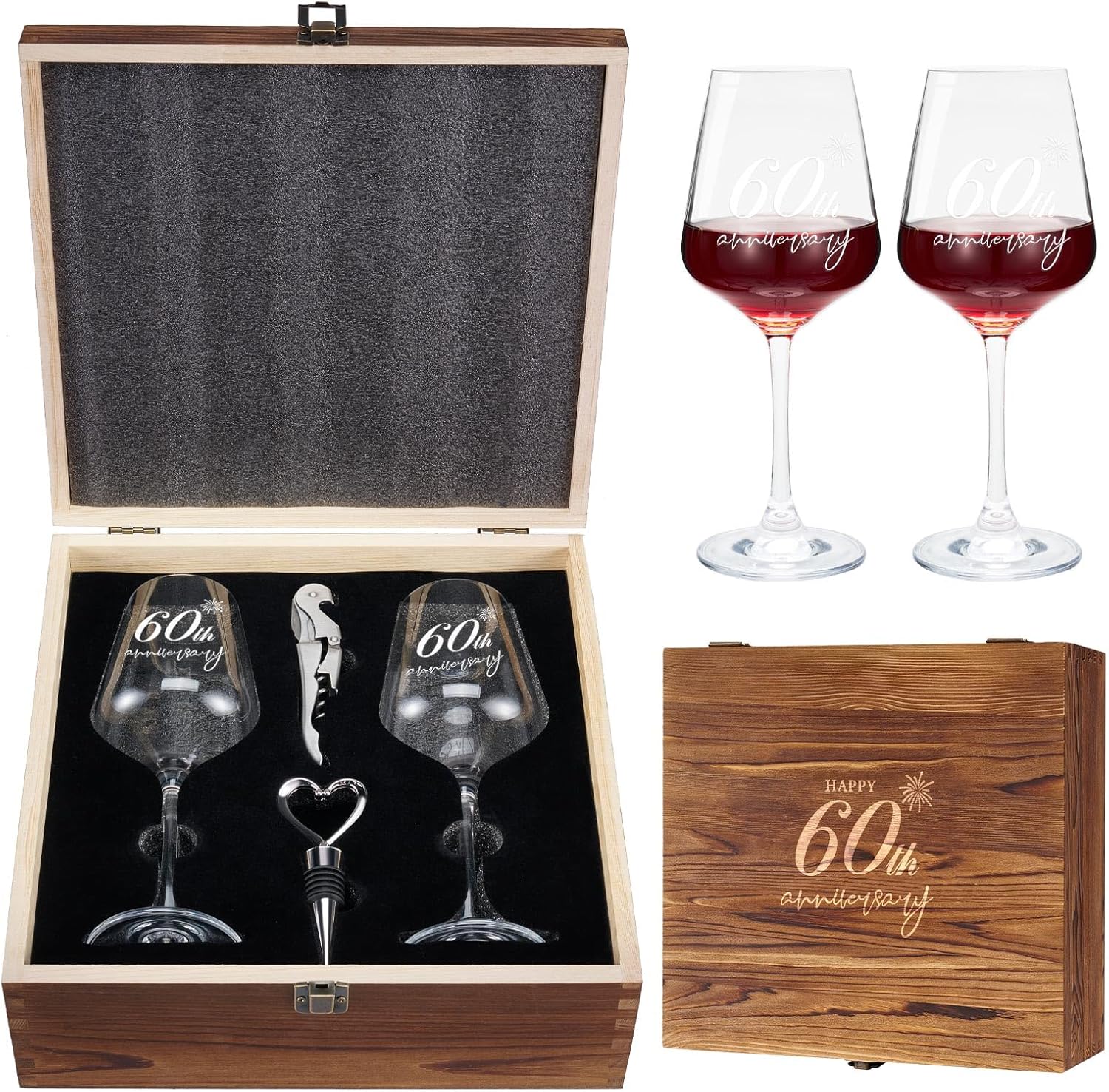 - Anniversary Wedding Gifts: Unveil a world of elegance with our Wedding Gifts Box. Inside, you'll discover 60th anniversary wine glasses, Wine Opener, Stopper and a precious Wooden Memory Box. Each glass is cradled in cushioned, ensuring they arrive unscathed. No need for rewrapping; it's a gift in itself.