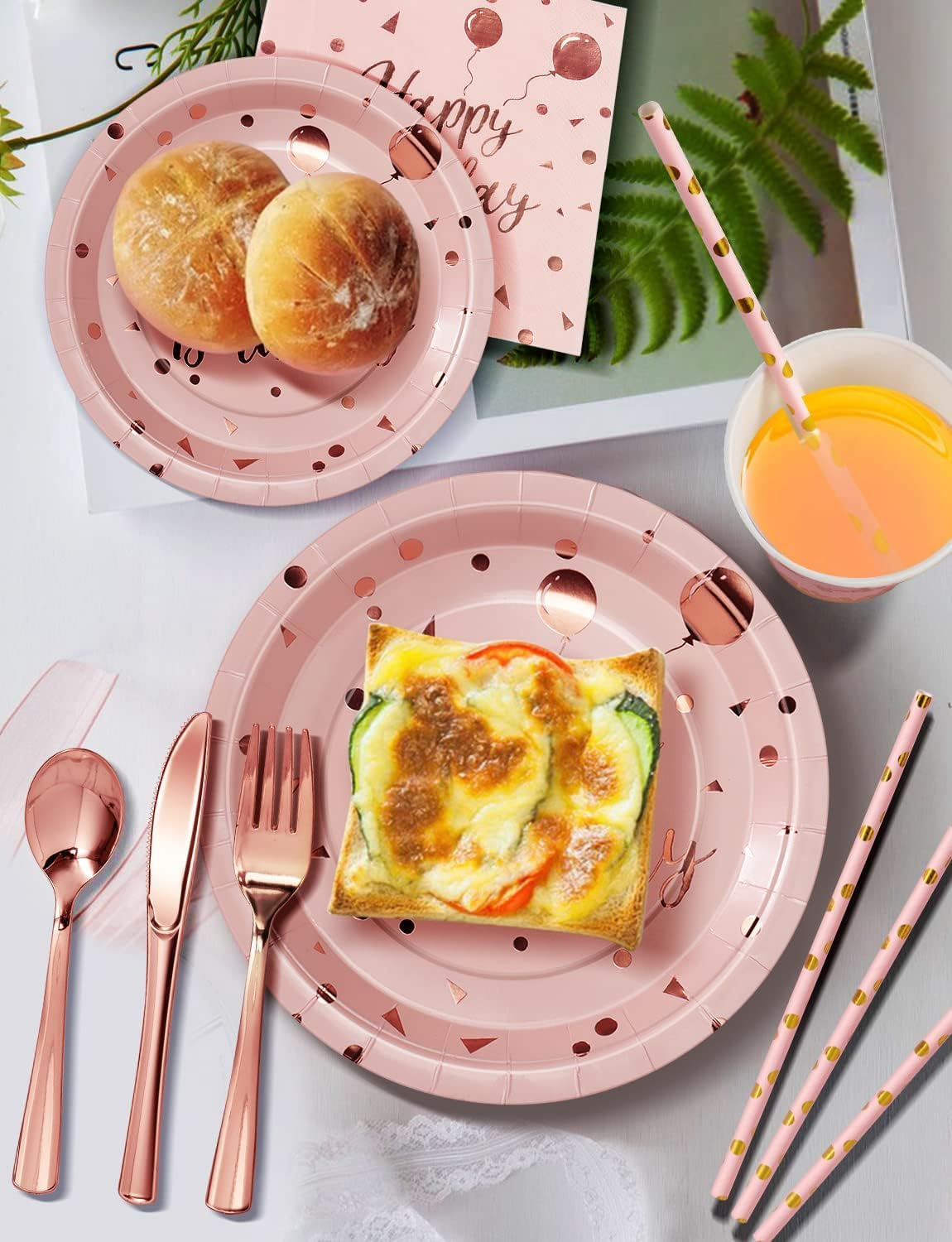 - 【High Quality and Elegant Design】Our party supplies pack features a Pink background and Rosegold foil polka dot pattern, adding a touch of sophistication to your event. Made of 100% food-grade paper, our plates are sturdy and can hold heavy foods without bending or breaking. All party dinnerware are made of BPA-free, non-toxic, and tasteless plastic that is very strong and won't bend or break.