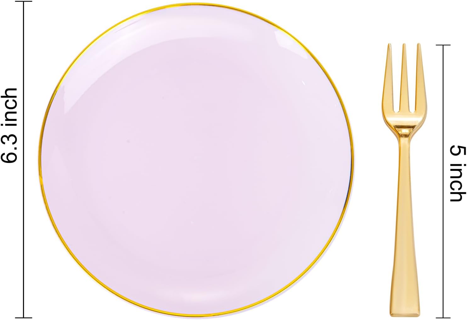 - 100 GUESTS: Purple dessert plates set for you to prepare 100pcs 6.3 “ lavender purple and gold plastic dessert plates and 100pcs 5 " gold plastic forks, a complete set to meet the needs of 100 guests to enjoy appetizers, cakes, desserts and other delicacies, purple plastic plates disposable and gold forks are ideal for large banquets and parties.