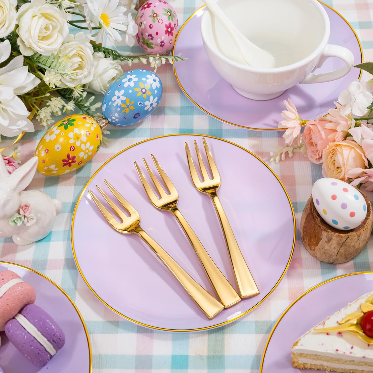 - EXQUISITE&ELEGANT DESIGN: Each lavender plates and fork is designed with sparkling gold color, adding a touch of brilliance to your table, the cake plates disposable set creating a gorgeous yet classy dining atmosphere and allowing guests to experience a feeling of dignity.