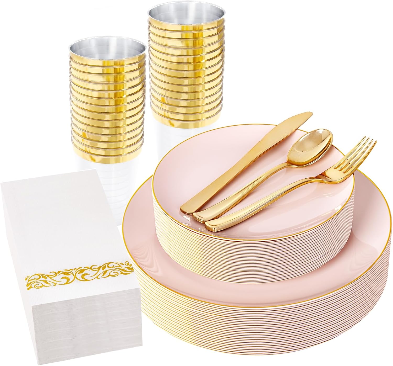 YOUBET 175PCS Pink Plastic Plates - Pink and Gold Disposable Plates Include 50 Plastic Plate, 75 Silverware, 25 Cups, 25 Napkins for Wedding & Party & Birthday