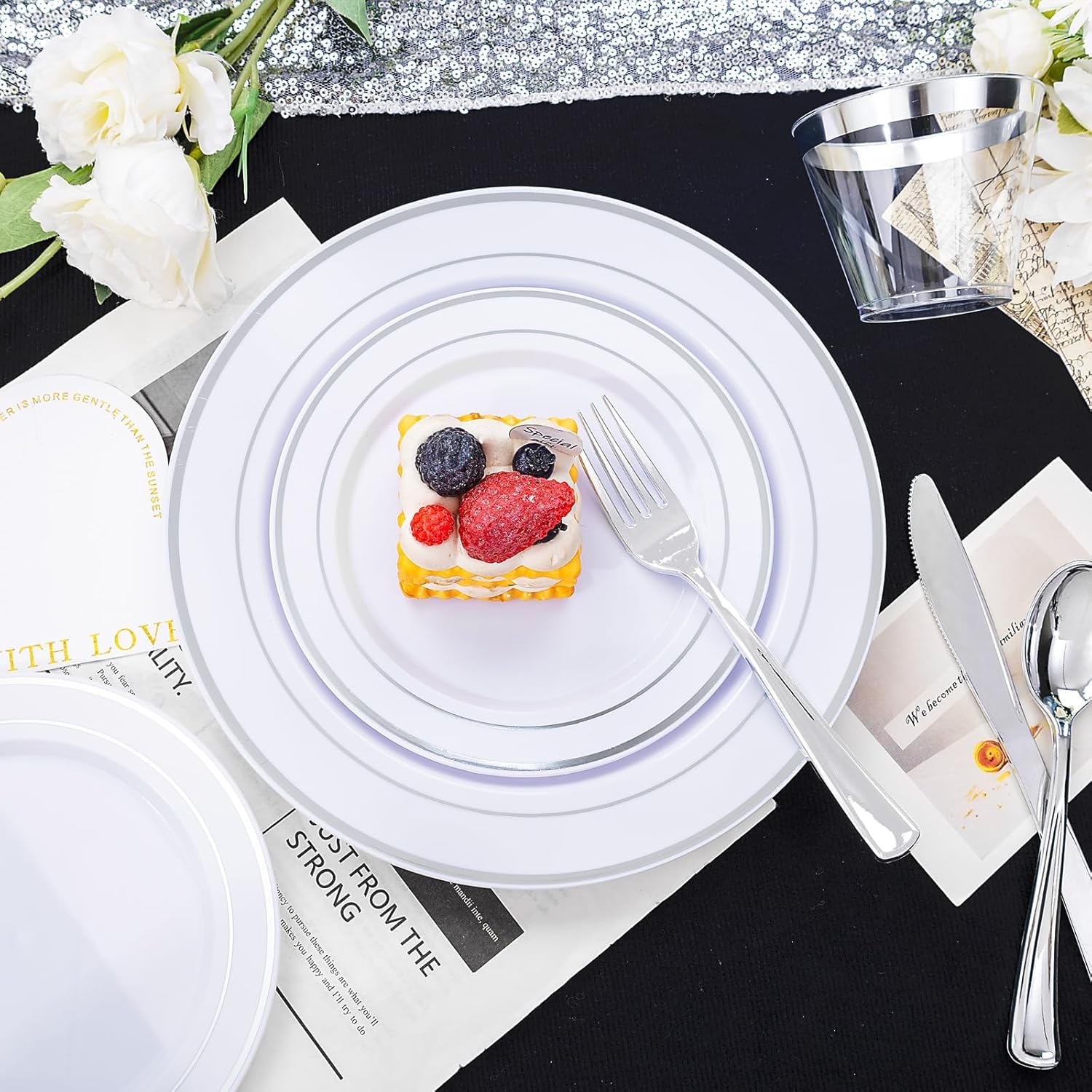 - GREAT VALUE SET: Our 100 guest silver disposable dinnerware set are include 100 plastic dinner plates, 100 dessert plates, 100 cups, 100 knives, 100 forks and 100 spoons. Whether it is breakfast, lunch or dinner, these plastic dinnerware set can meet all your needs