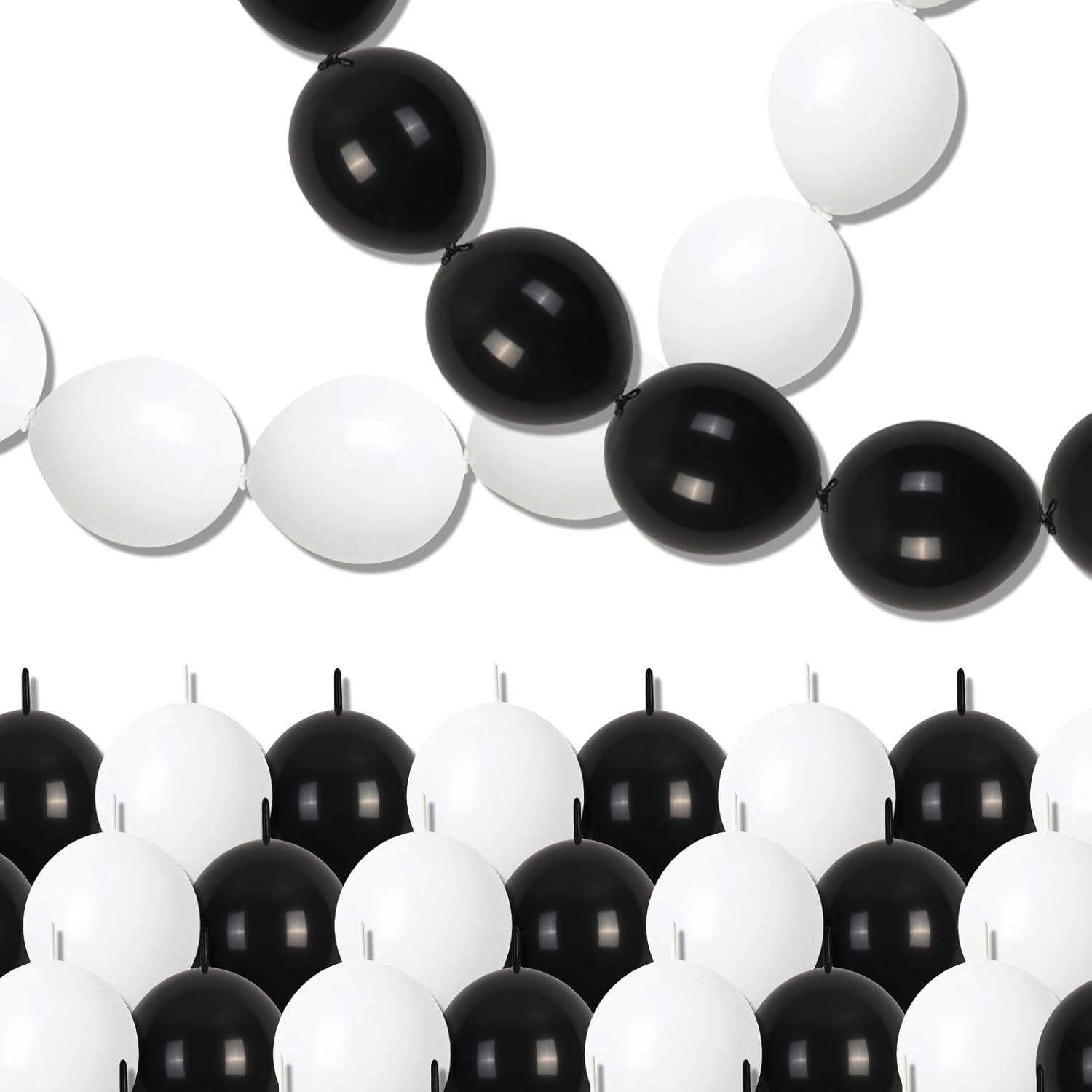 - ๐ซBalloon Chain Garland - You will receive 100 pcs of 10inch black and white balloons, include (black link balloons 10inch*50pcs, white link balloons 10inch*50pcs). Our quick link balloons have a unique tail design that allows balloons link to be easily. More convenient and easier to assemble than regular balloons.