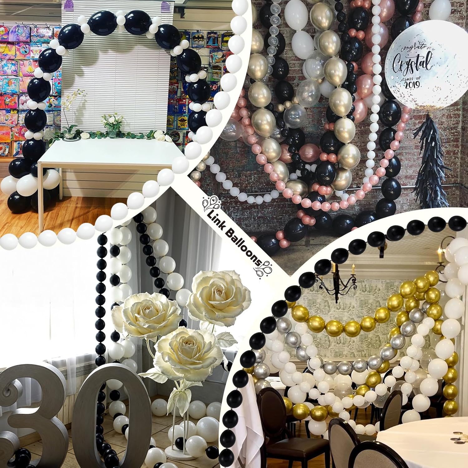 - ๐ซDiverse assembly - The linking balloons is an excellent choice for balloon chain decoration, balloon wall creation, and various balloon model making. It can be used for party decoration, it can be hung on the ceiling alone to form a hanging balloon chain, can be used for balcony balloon chain decoration, and can be freely matched and connected the black balloons and white balloons according to different styling needs.