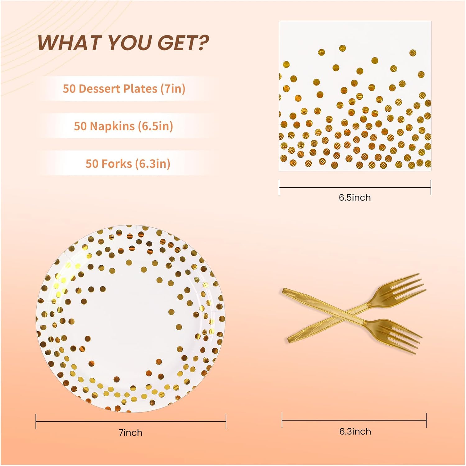 150PCS Paper Plates and Napkins Set - White and Gold Dot Disposable Party Dinnerware Includes Paper Plates, Napkins, Forks Decorations for Birthdays, Graduations, Weddings and Holidays, Serves 50