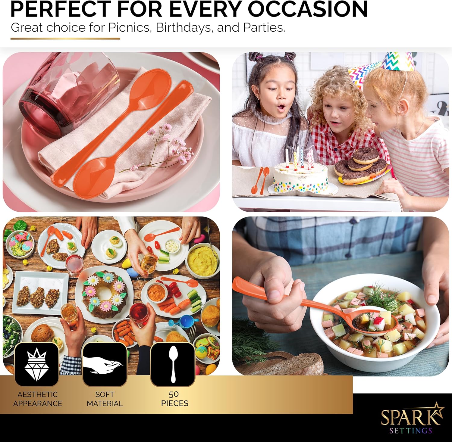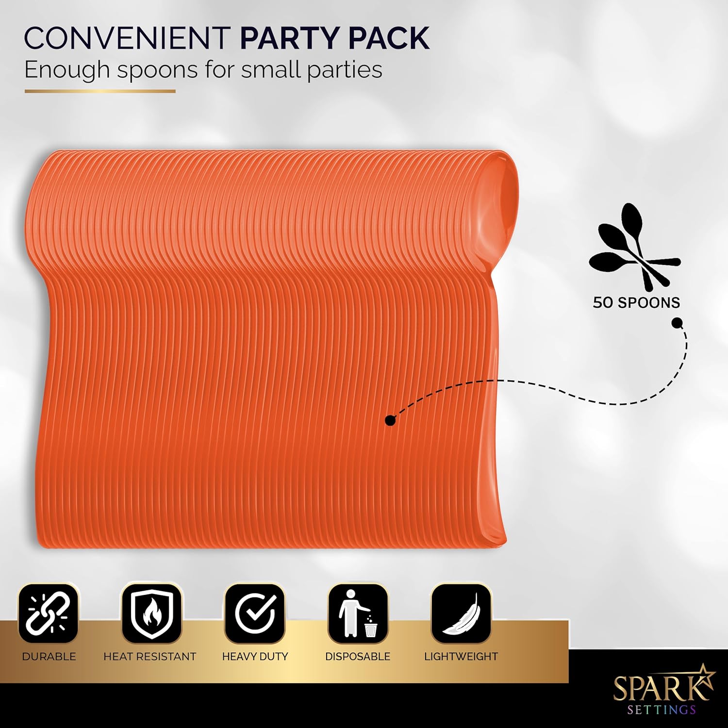 Disposable Orange Plastic Spoons - Heavy Duty, Ideal for Hot & Cold Food, Perfect for Home, Office, School, Parties & Weddings - 50 Pack