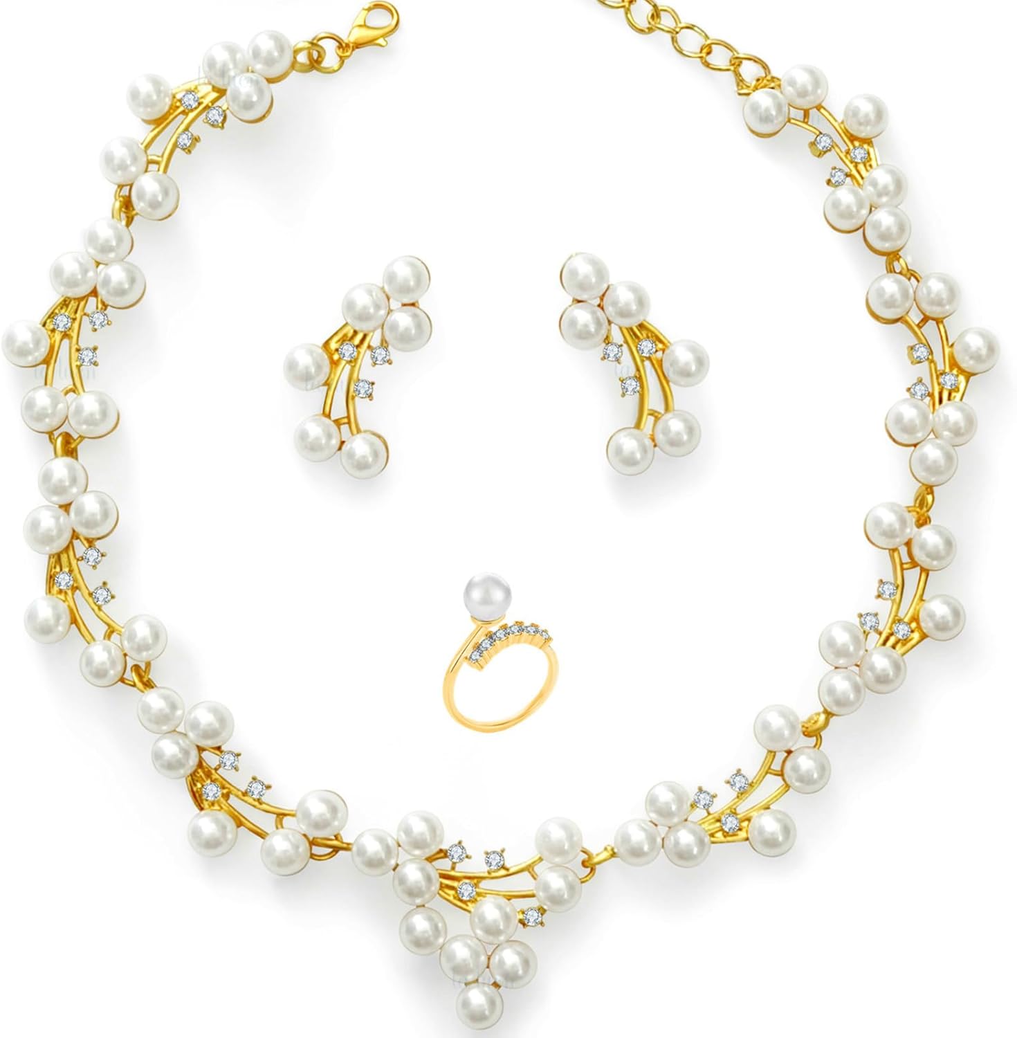 - Pearl Choker Jewelry Set-- golden faux pearl jewelry set: Includes 1*pearl necklace, 1*Adjustable pearl ring, 2*pearl earrings. Women's pearl necklace and earring sets can be worn alone or with other jewelry for different occasions