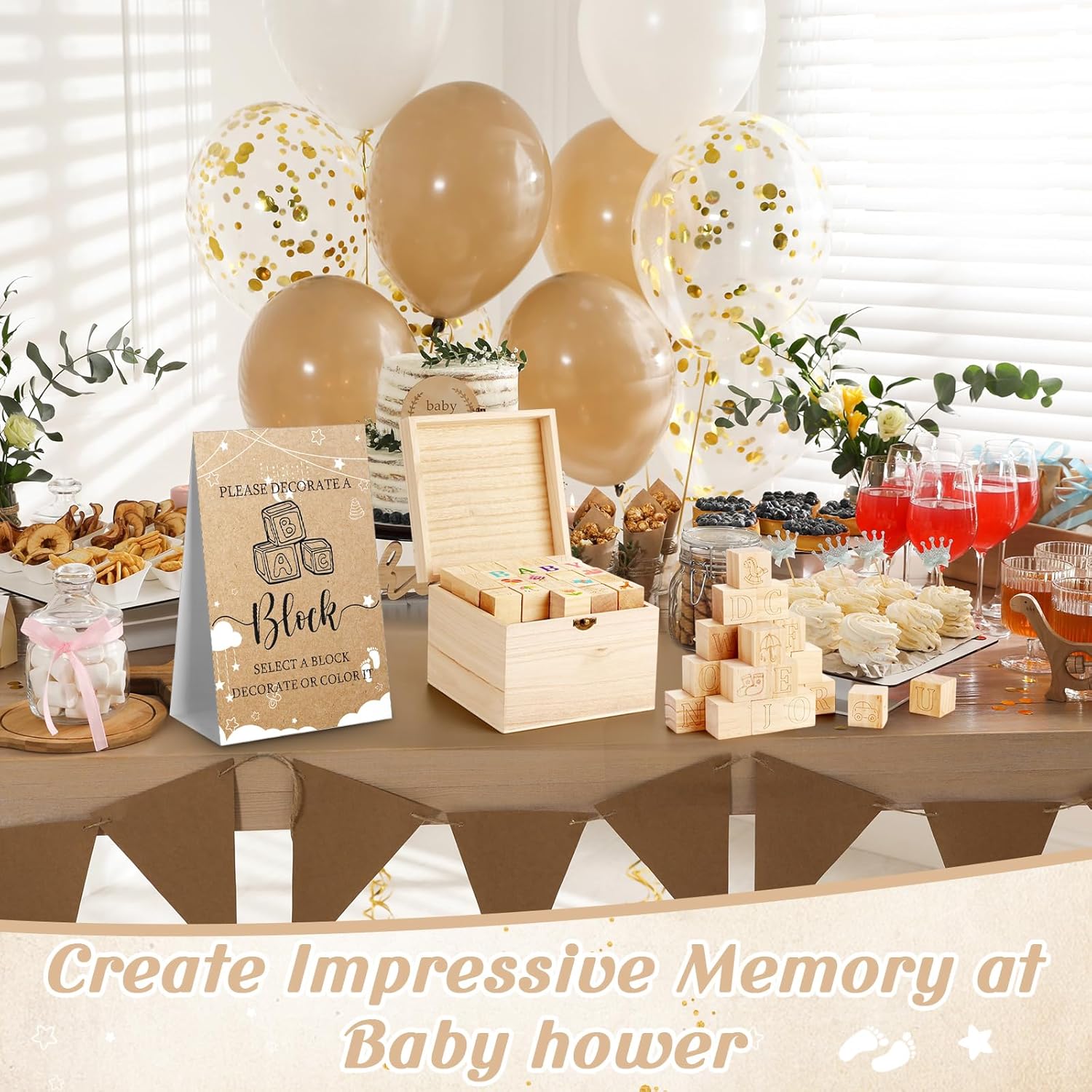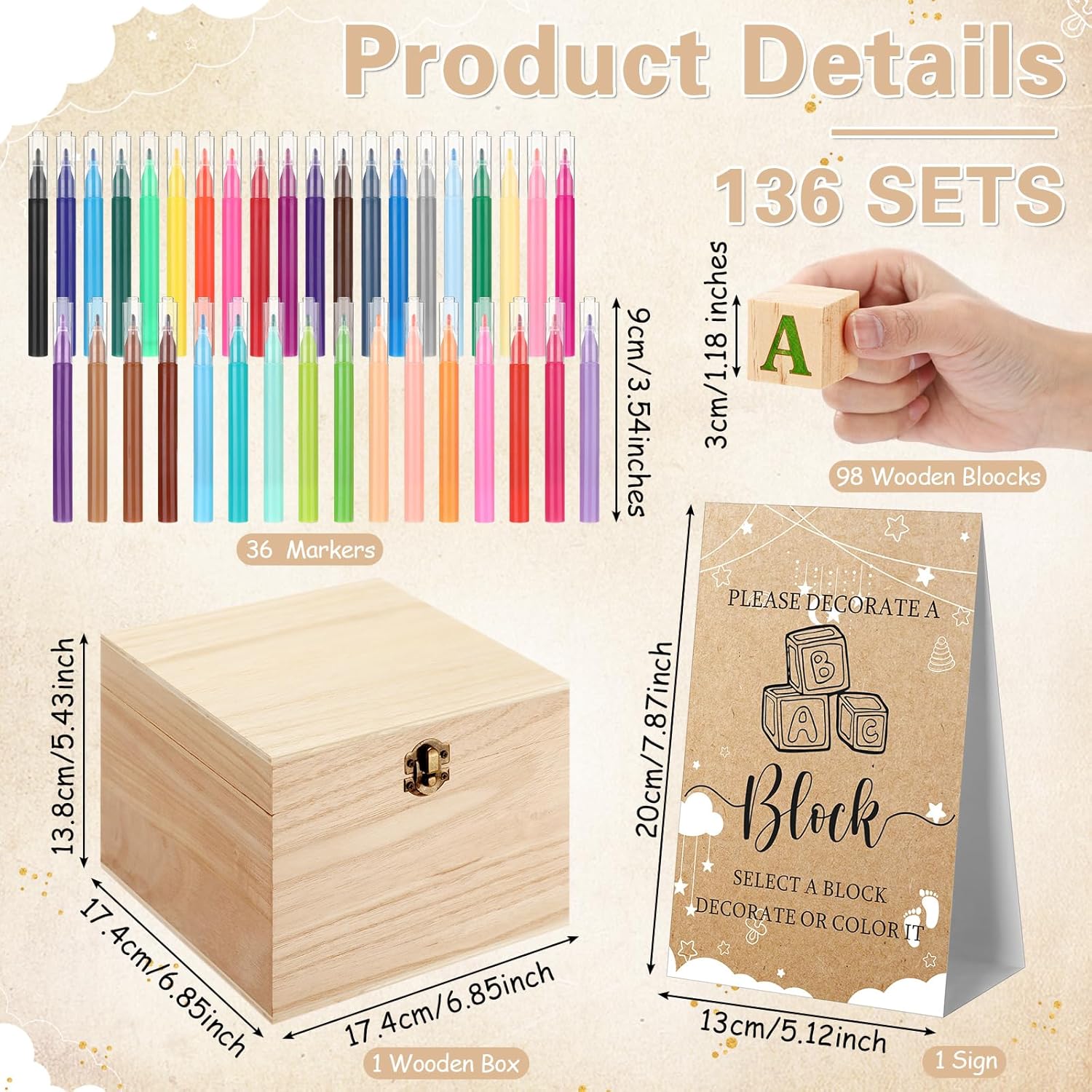 - Funny Baby Shower Games Set: our baby shower blocks kit includes 98 wooden blocks featuring 3 sets of 26 alphabets, numbers 0-9, and 10 patterns; It also comes with 1 game sign, 36-color acrylic markers and a wooden box, Suitable for baby showers and gender reveal parties