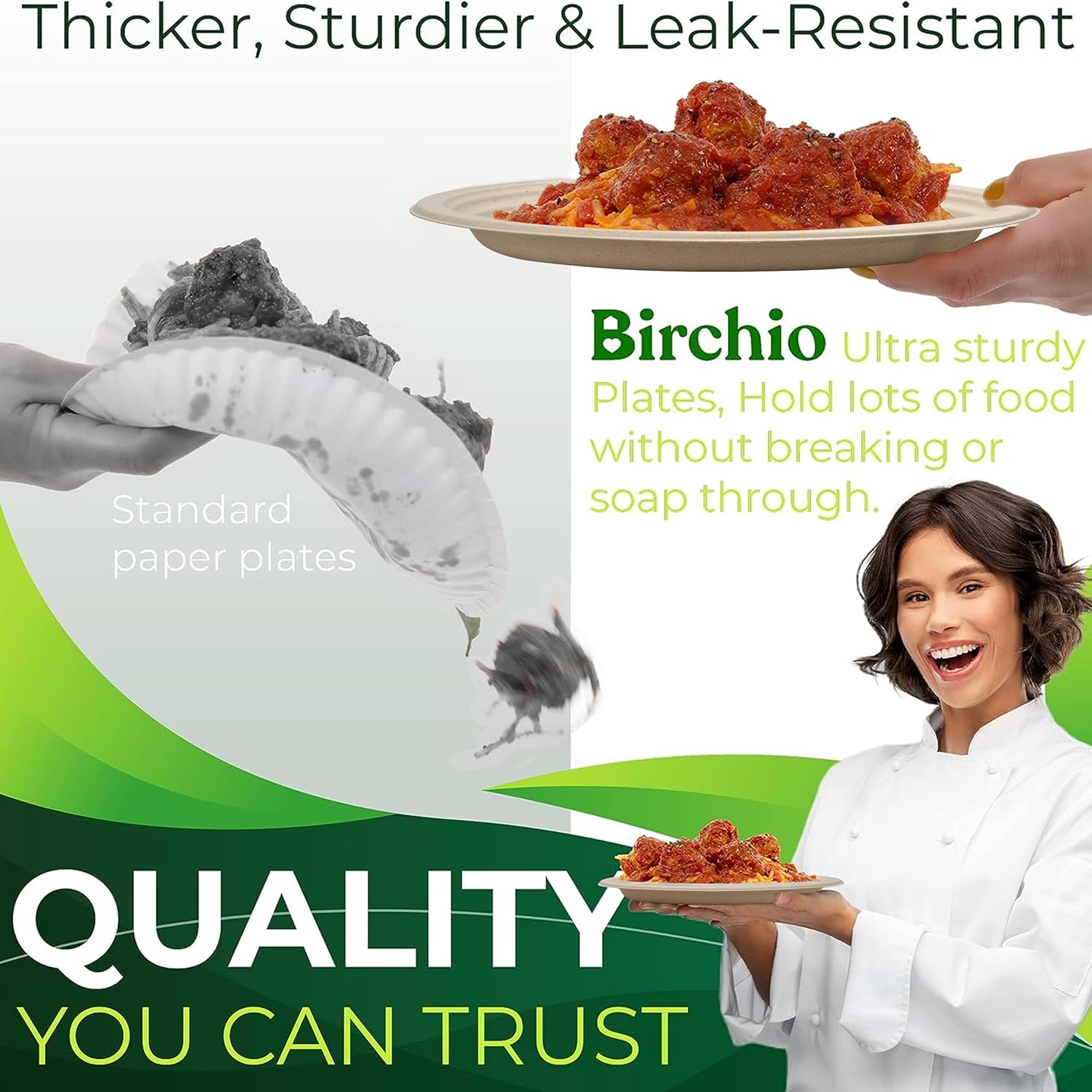 - ๐ฟ ใThicker, Sturdier & Leak-Resistantใ- Our unique process mixed Bamboo and Bagasse to create heavy-duty compostable plates you will love! Bamboo has natural strength and liquid resistant characteristics that help provide superior strength and reduce unnecessary leaks. They can even handle the messiest food items thanks to the oil proof design. The wide rim design allows you to serve saucy foods on the plate without worrying about spills and messes.