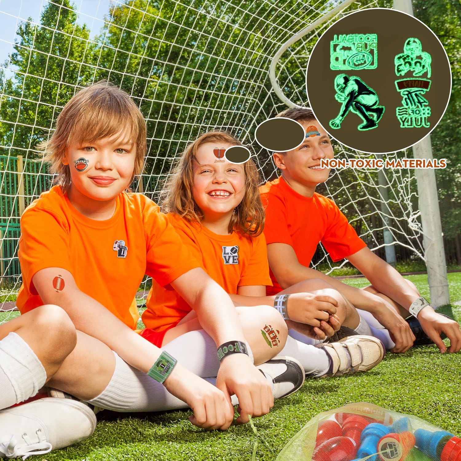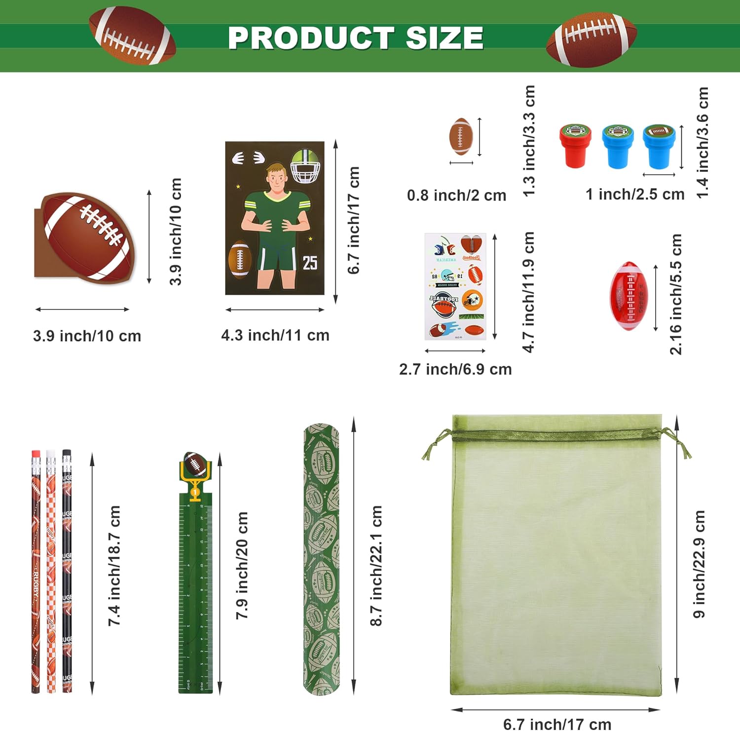 - Proper size: this football gift set includes a variety of items, such as cards measuring about 3.9 x 3.9 inches/10 x 10 cm, DIY stickers and glow tattoos both about 6.7 x 4.3 inches/17 x 11 cm, pencils about 7.4 inches/18.7 cm, slap bracelets about 8.7 inches/22.1 cm, rulers about 7.9 inches/20 cm, and organza bags about 9 x 6.7 inches/22.9 x 17 cm