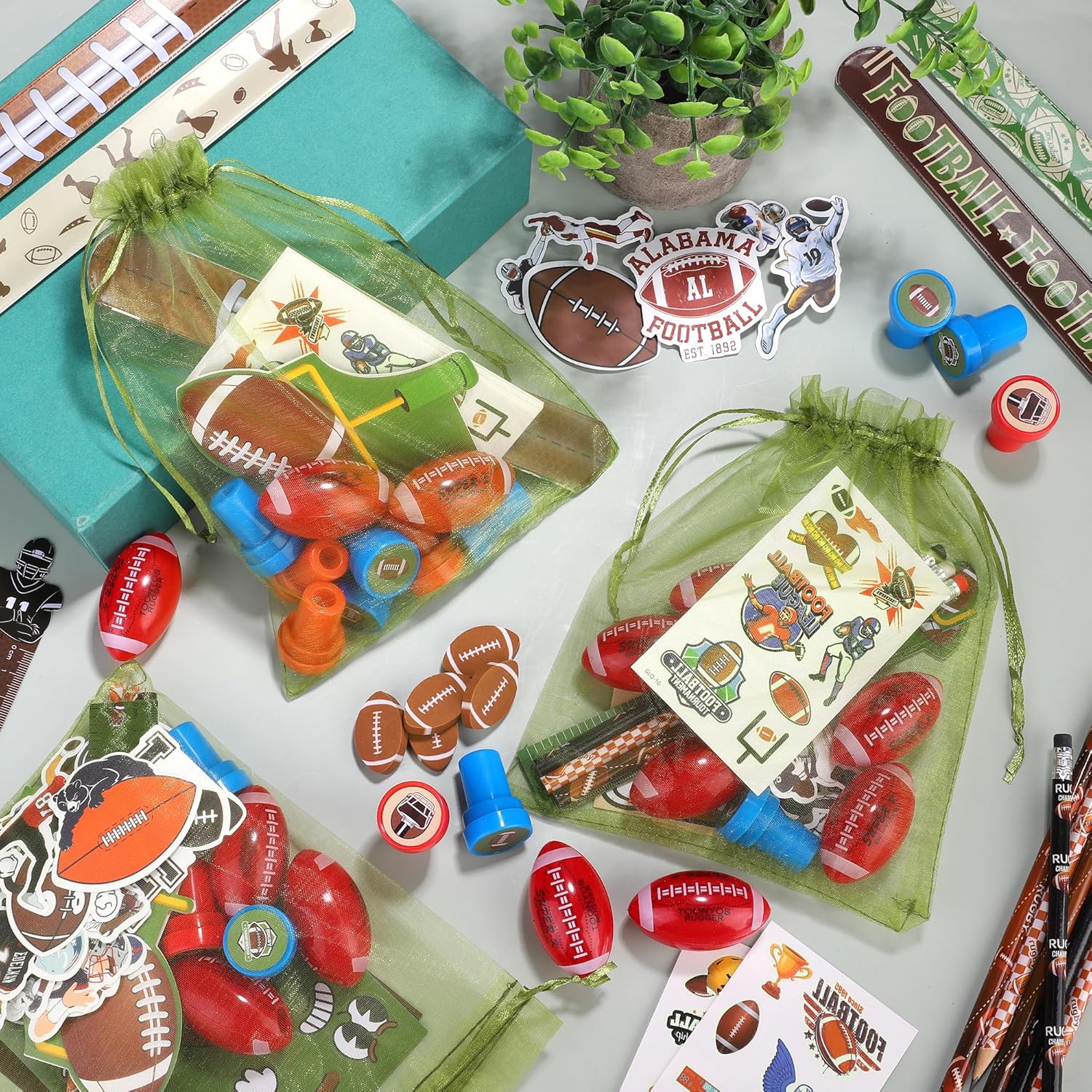 - Comprehensive party pack: this football party favors set includes 12 mini cards, 12 DIY stickers, 12 pencils, 12 sharpeners, 12 erasers, 12 slap bracelets, 12 stamps, 12 glow-in-the-dark tattoos, 12 rulers, 50 loose stickers, and 12 organza bags, enhancing your football-themed party with fun and flair