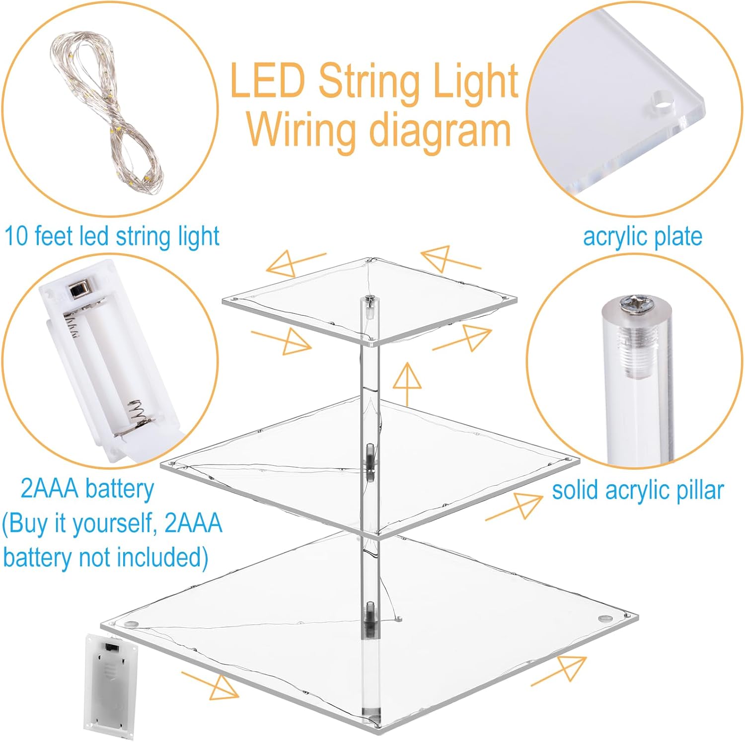 - Premium Materials: 3 Tier dessert table display set is made up of acrylic with a height of 8.8IN. There are 5 silicone pads at the bottom of the cupcake holder to prevent slipping. In addition, there are 10-foot led lights with holes in the edge of the cupcake stand, and you can wind strings of lights to decorate the cupcake display