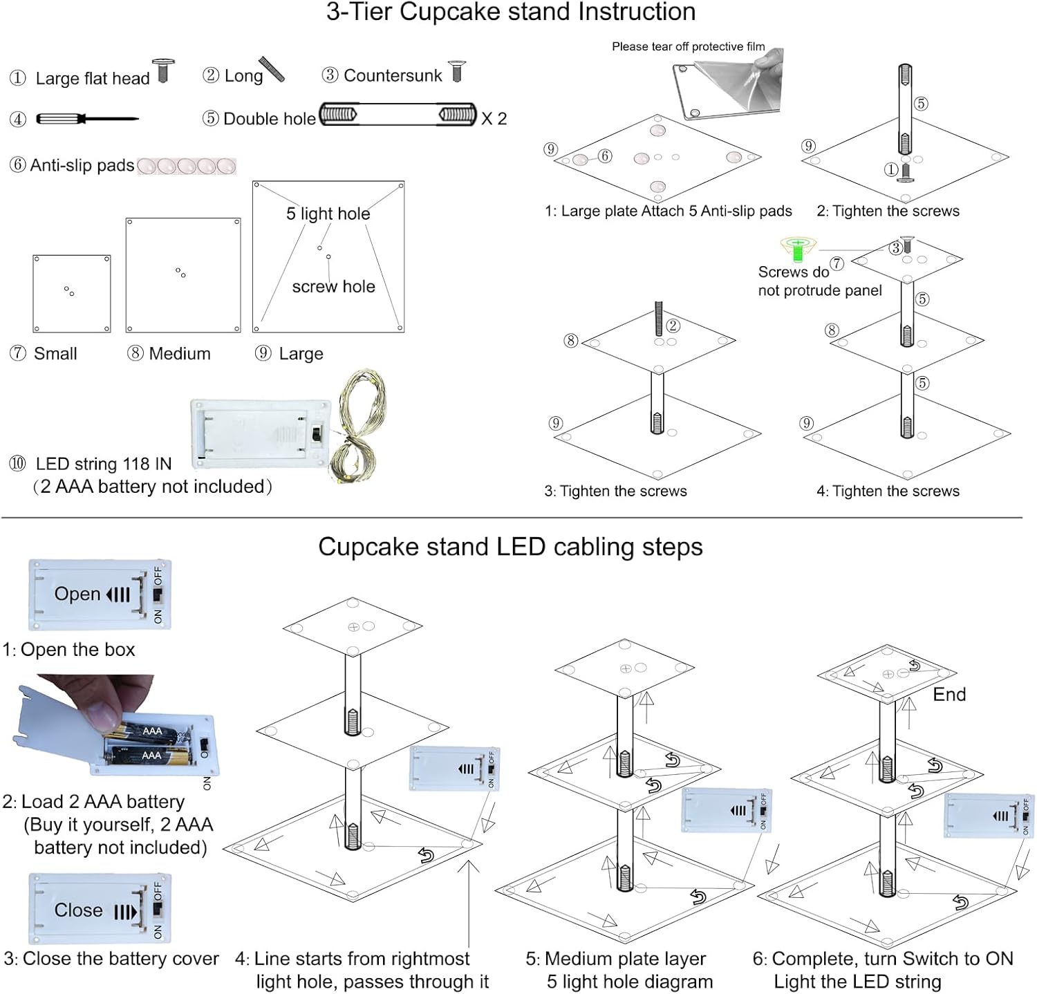 - What You Get: Cupcake tower include 1 X 3 tier cupcake stand, 1 X Phillips Screwdriver, 1 X 10 feet LED Light (2 AAA battery not included), 1 X Specification