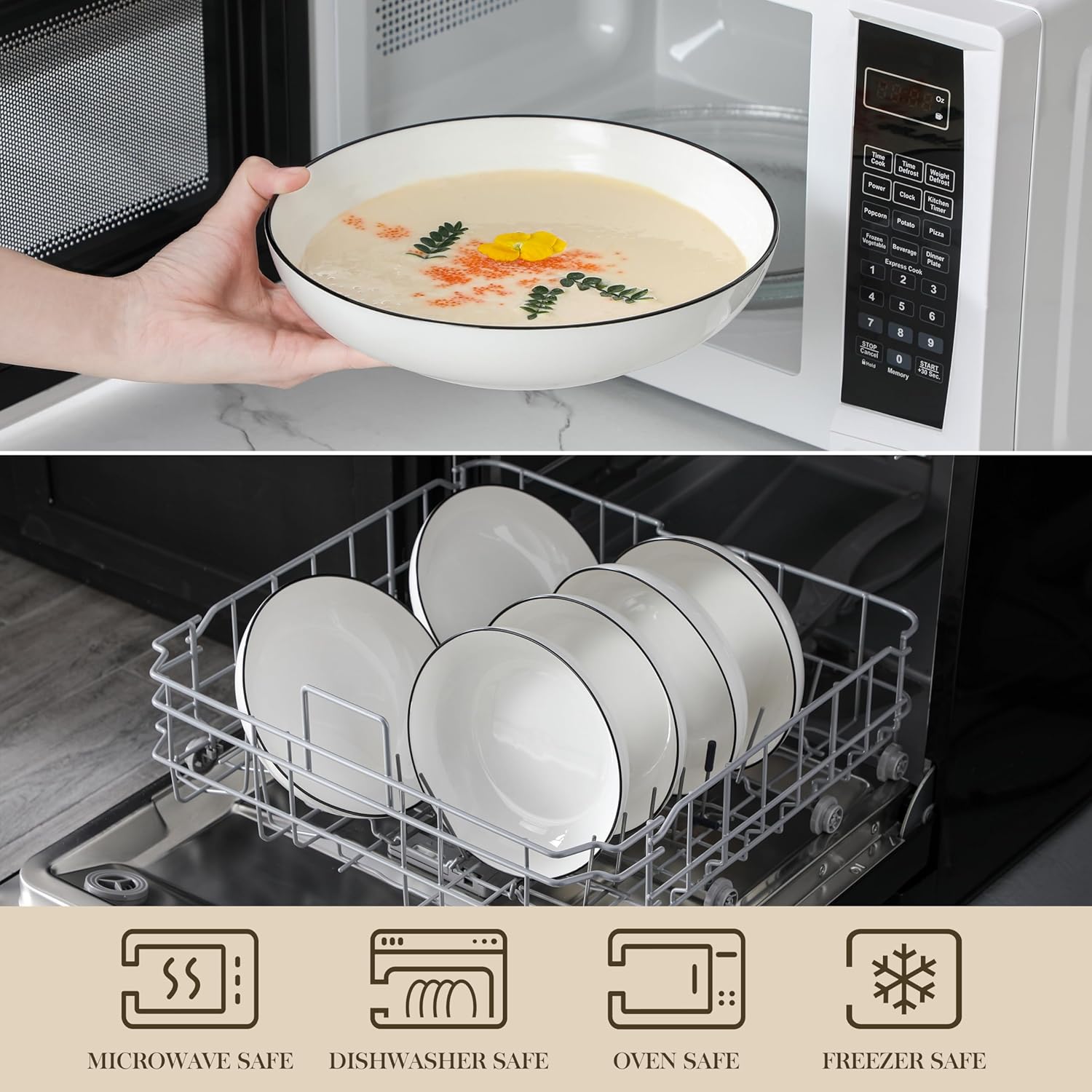- 【WIDE & SHALLOW DESIGN】White Pasta Bowls featuring a wide and shallow design prevents spills and messes. Featuring a modern and minimalist design with a classic white finish and smooth glaze, these bowls complement any table setting and enhance dining experience.