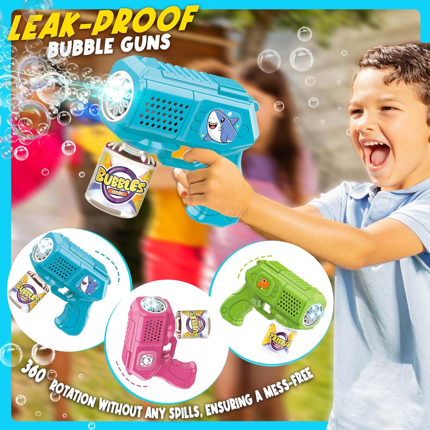 - Vibrant Bubbles with Light-Up Fun: This 3-pack bubble gun ensures triple the fun, over 5000 bubbles per minute, illuminated by light-up features that add excitement to every play session