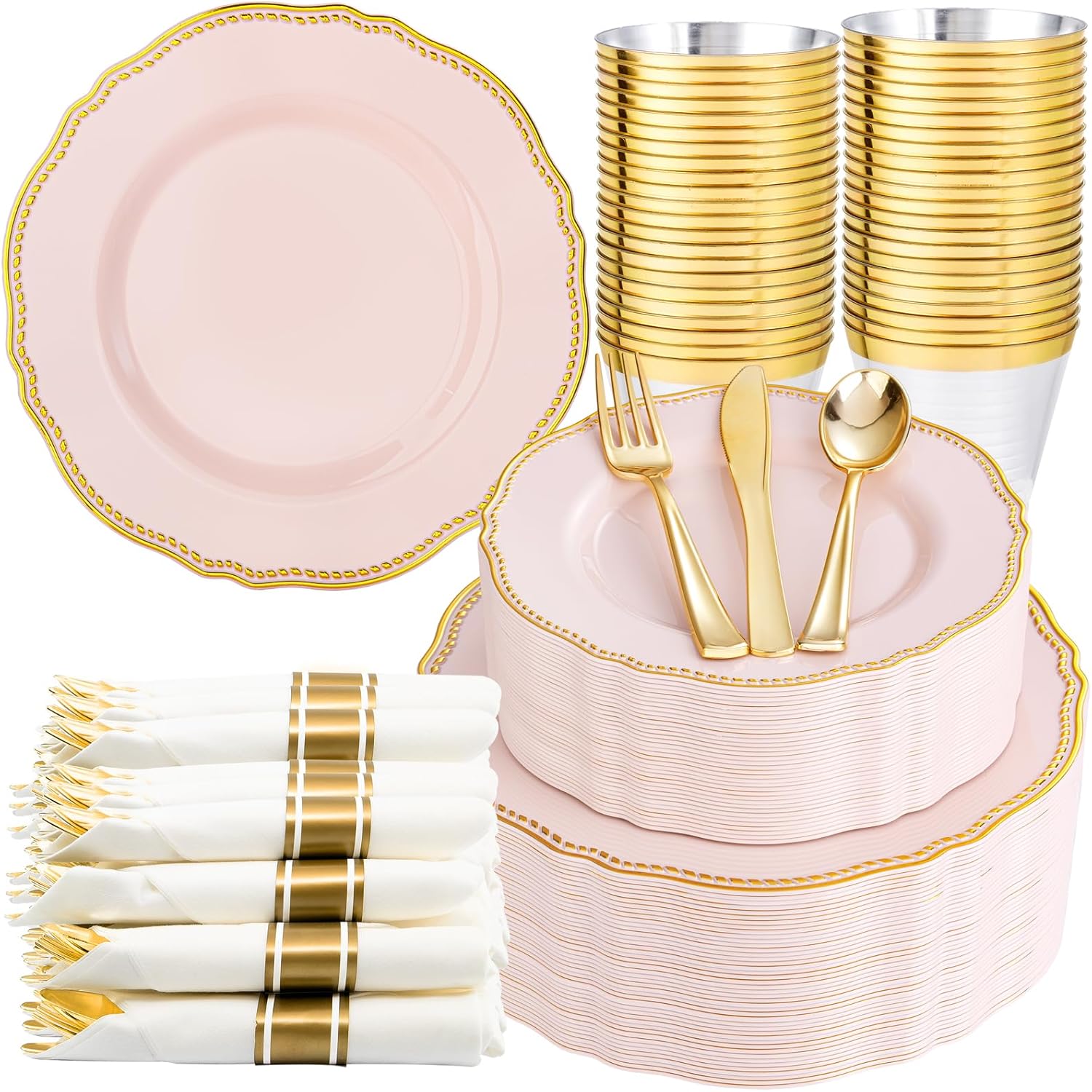 - Complete Set: This 350-piece pink and gold dinnerware set includes everything you need to serve 50 guests: 50 pink and gold dinner plates, 50 pink and gold dessert plates, 50 gold knives, 50 gold forks, 50 gold spoons, 50 clear cups with gold rim, and 50 rolled napkin cutlery. These heavyweight party plates can hold any type of food, perfect for picnics and holiday gatherings. The matching gold dinnerware set adds an exquisite touch to your events.
