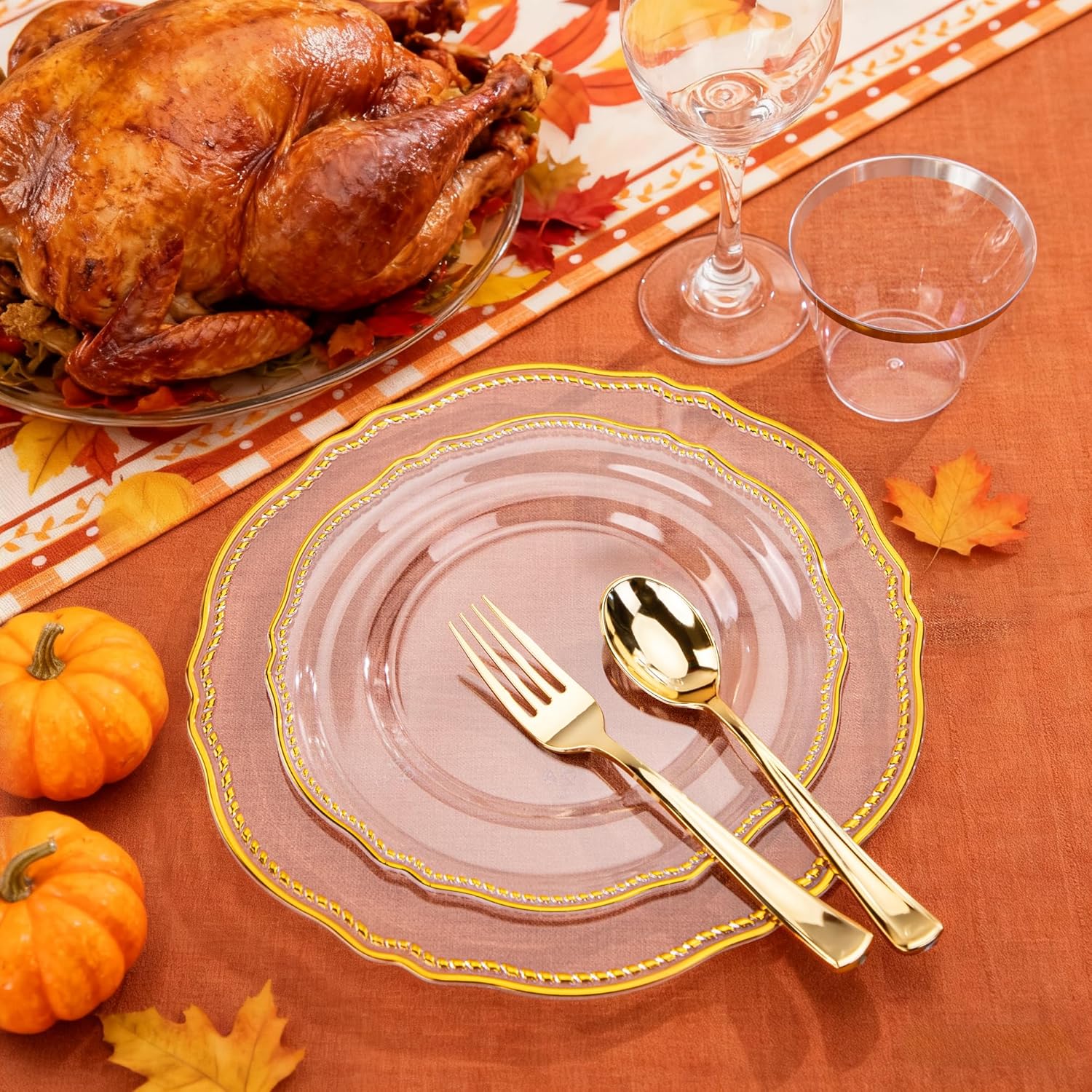 - Complete Set: This 175-piece disposable dinnerware set includes everything you need to serve 25guests: 25 clear with gold rim dinner plates, 25 clear with gold rim dessert plates, 25 gold knives, 25 gold forks, 25 gold spoons, 25 clear cups with gold rim, and 25 napkins. These heavyweight party plates can hold any type of food, perfect for picnics and holiday gatherings. The matching gold dinnerware set adds an exquisite touch to your events.
