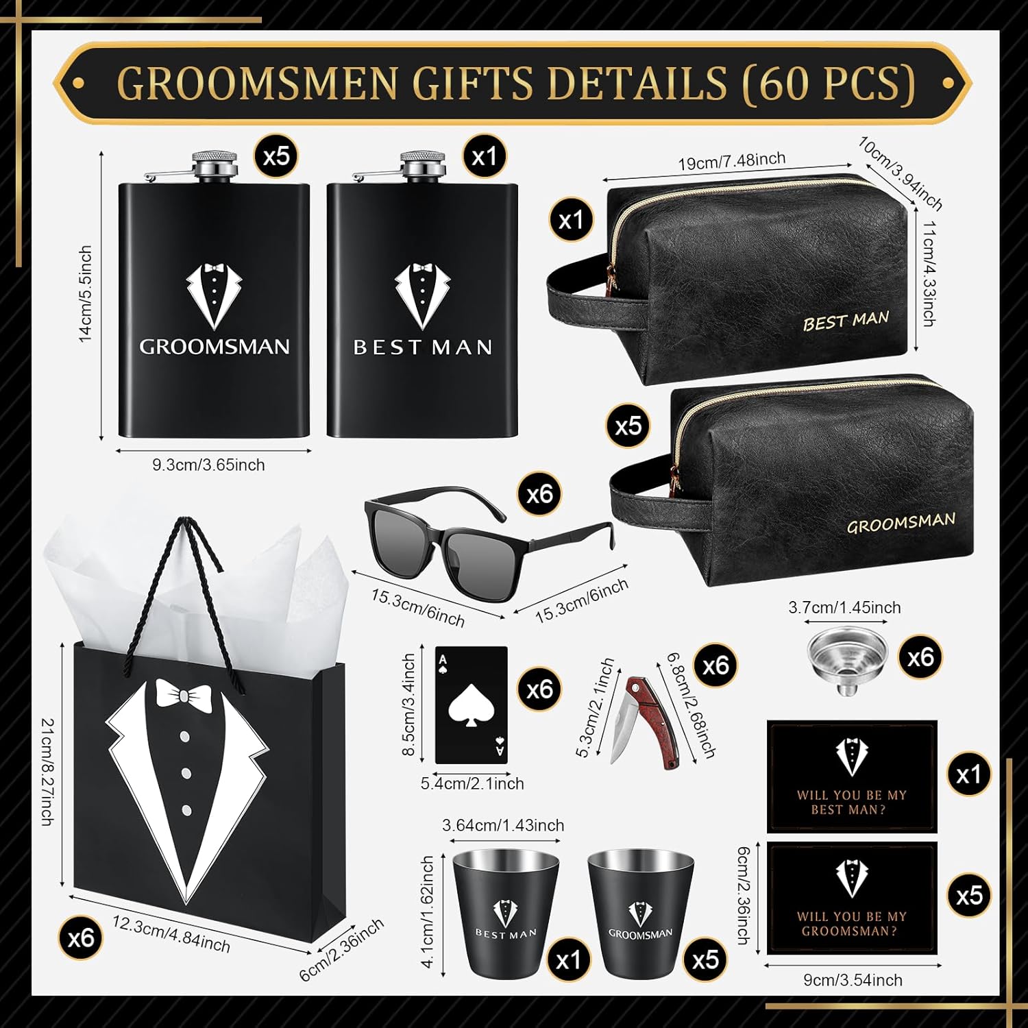 - Comprehensive Groomsmen Gift Set: 60Pcs Groomsmen Gifts Set of 6 includes 6pcs 8 oz Stainless Steel Tuxedo Flasks, 6pcs Elegant Stainless Steel Shot Glasses, 6pcs Funnel, 6pcs Mini Wood Folding Tool for Crafting, 6pcs Poker Card Bottle Openers, 6pcs Sunglasses, 6pcs PU Leather Toiletry Bags, 6pcs Gift Bags, 6pcs White Tissue Paper, and 6pcs Thoughtful Cards, Making it an ideal gift choice for your groomsmen on your special day.