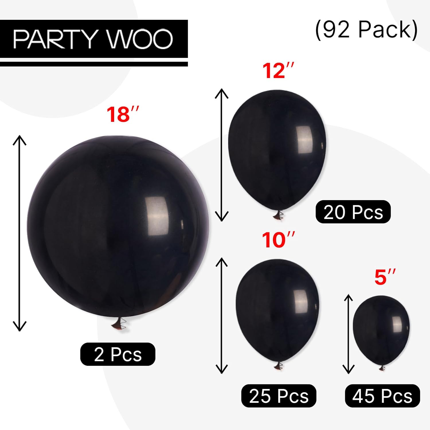 - 92 PCS BLACK BALLOONS IN DIFFERENT SIZES: Includes 18 inch (2 pcs), 12 inch (20 pcs), 10 inch (25 pcs), and 5 inch (45 pcs). These large and small balloons are perfect for creating stunning balloon garlands and arch kits