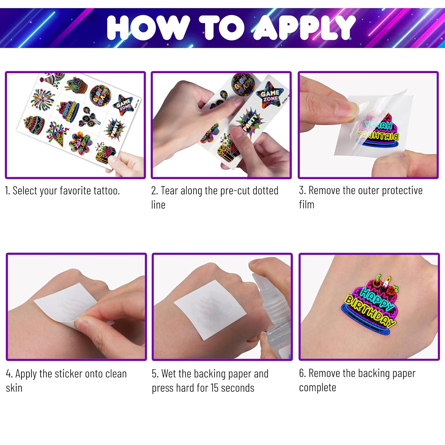 - Simple Application: With just a few easy steps, your child can apply these tattoos effortlessly. Tear off the tattoo of choice and remove clear sheet. Place tattoo face down on skin. Wet the tattoo thoroughly. After 15-20 seconds, gently remove the backing paper. Allow the tattoo to dry. These delicate stickers are usually retained all days and can be cleaned with baby oil or hand sanitizer.