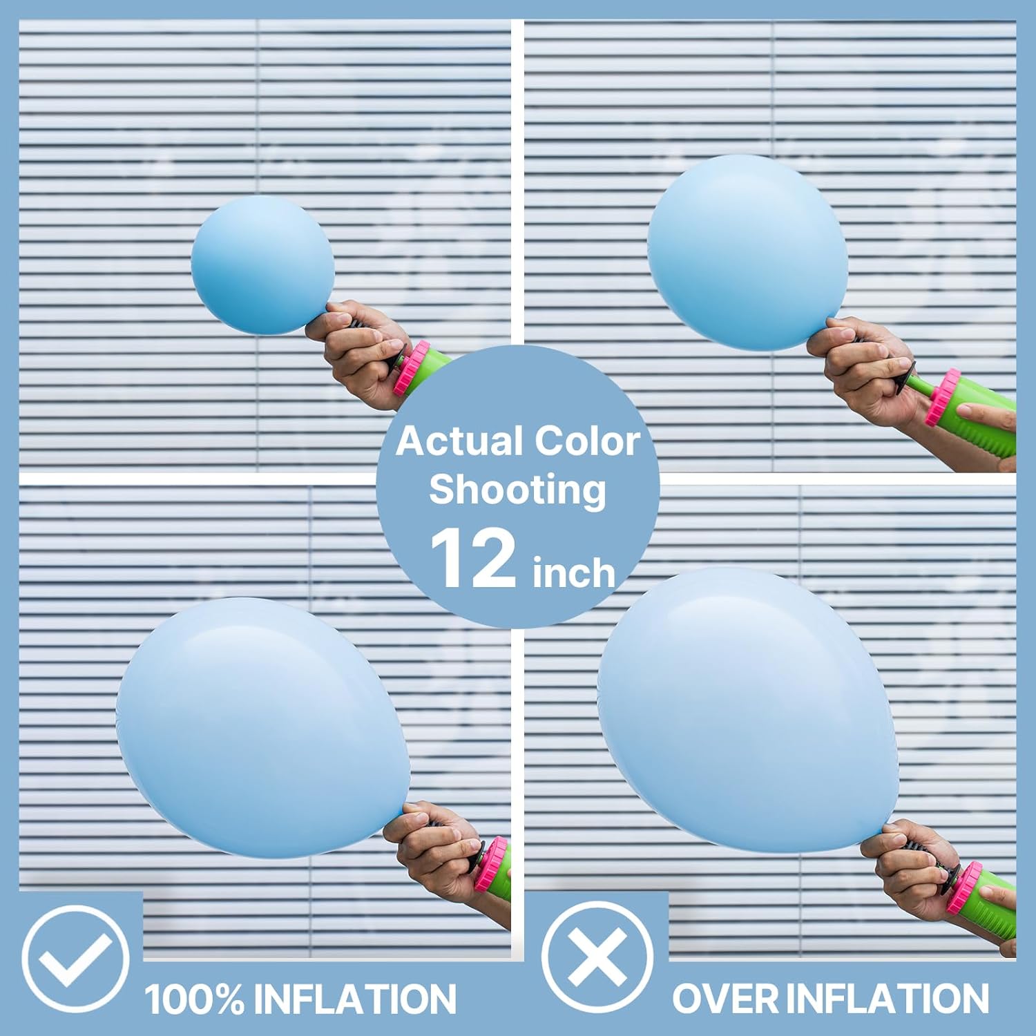 - WARM REMINDER: Do not overinflate the blue latex balloons beyond 90%. Keep the balloons round when inflated, and avoid exposing them to direct sunlight, extreme heat, sharp objects, or excessive friction
