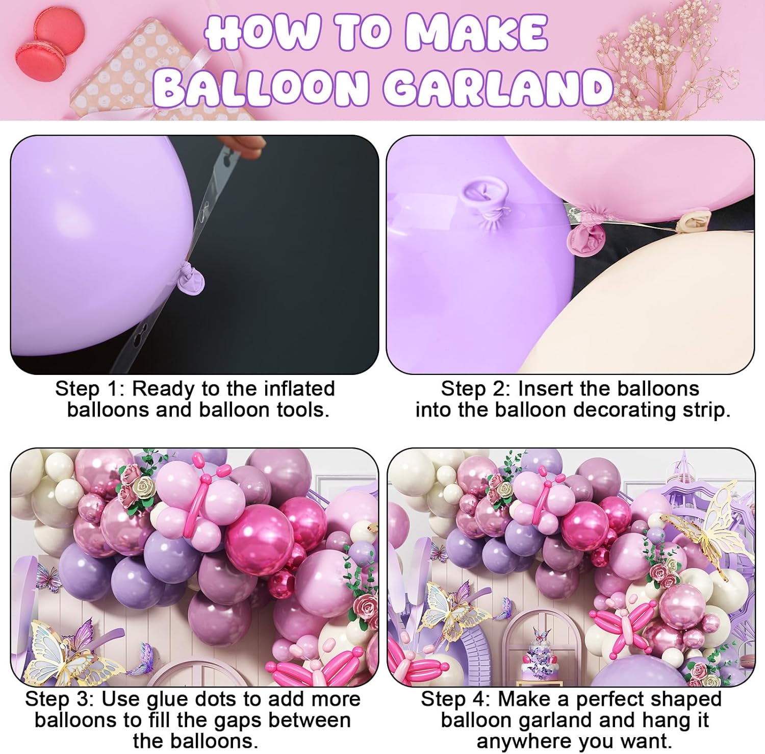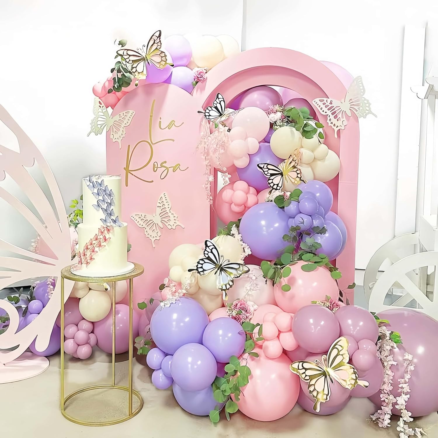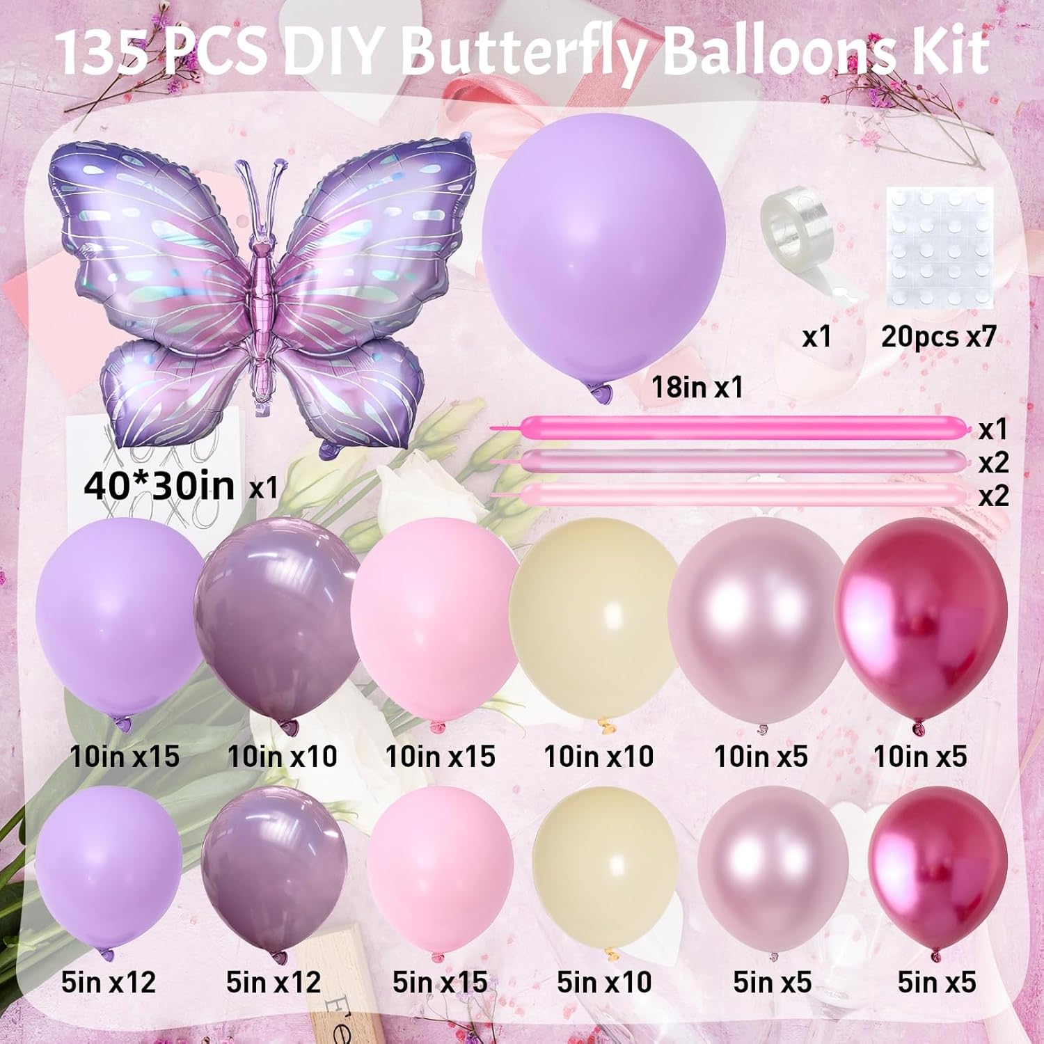 - 🦋135 PCS DIY Butterfly Balloon Arch: Butterfly Foil Balloon (40x30-in x 1), Macaron Purple Balloons (18-in x 1, 10-in x 15, 5-in x 12), Ivory White Balloons (10-in x 10, 5-in x 10), Dusty Purple Balloons (10-in x 10, 5-in x 12), Baby Pink Balloons (10-in x 15, 5-in x 15), Metallic Fuchsia Balloons (10-in x 5, 5-in x 5), Metallic Pink Balloons (10-in x 5, 5-in x 5), Long Balloons for Creating Butterfly: (Metallic Pink x 2, x 2, Hot Pink x 1, Balloon Chain x 1, Dots x 7 packs (20 pcs each).