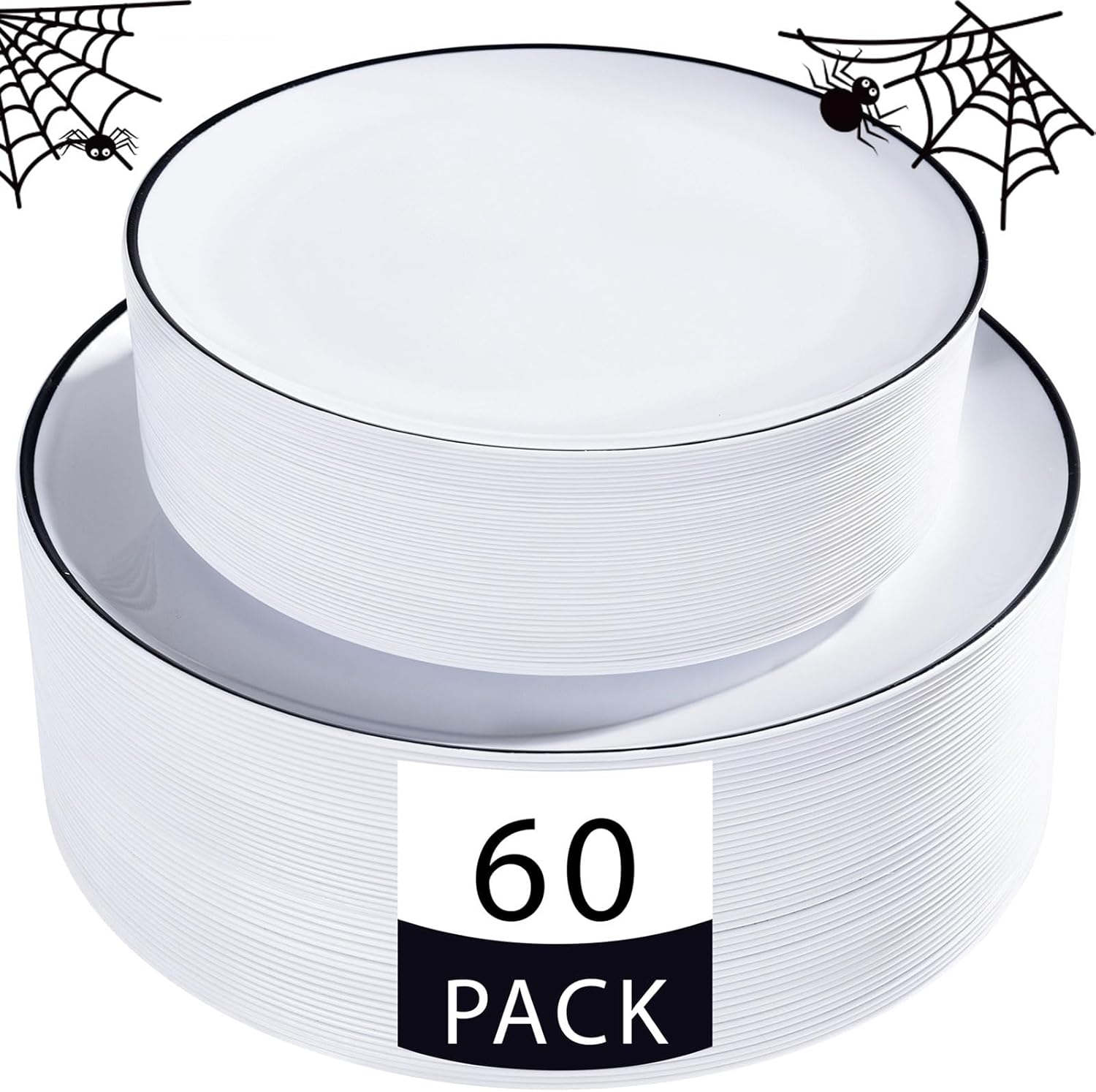 LIYH 60 Pcs White Plastic Plates Disposable for Party Halloween Plates Black and White Plastic Disposable Heavy Duty Party Wedding Plate Including 30 Dinner 10.25” & 30 Dessert Plate 7.5"