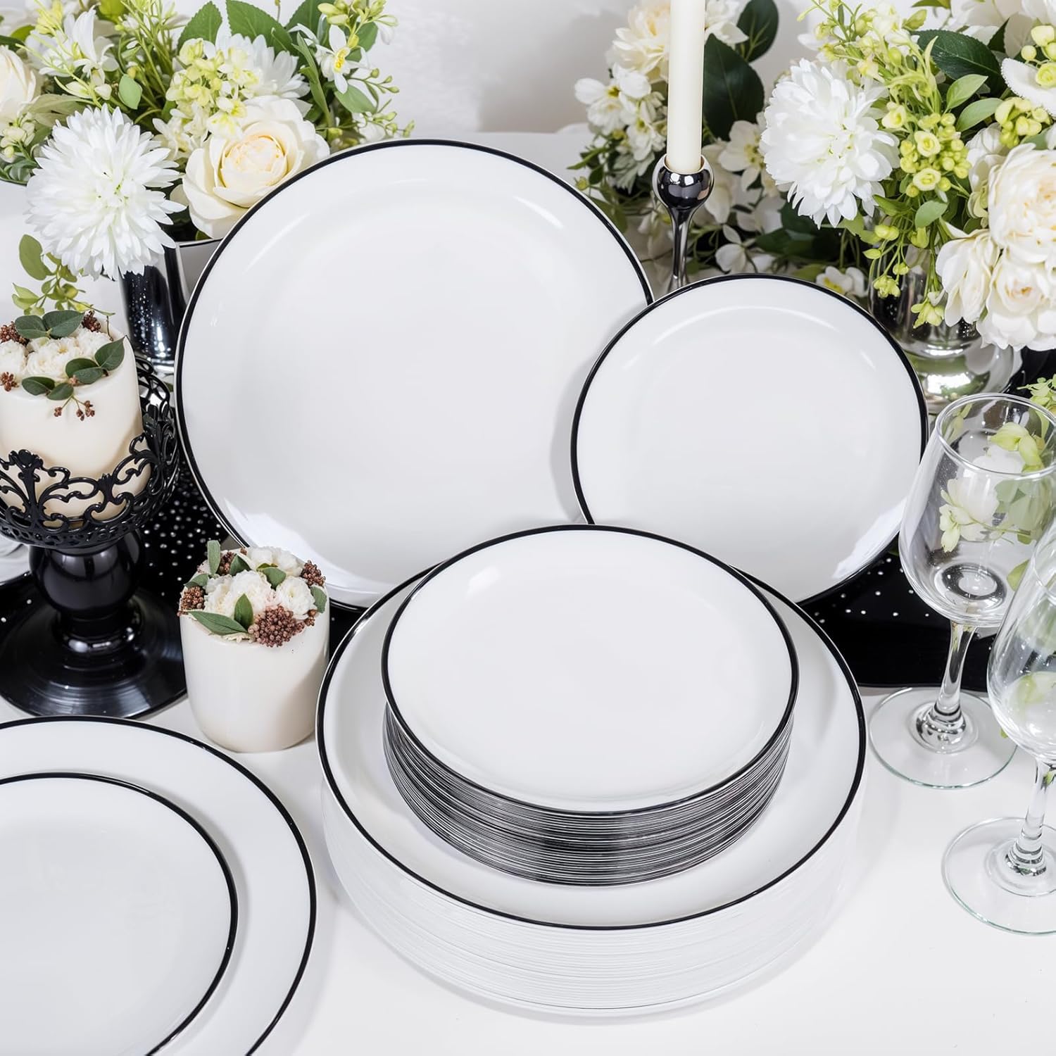 - 【Luxury Meets Convenience】Impress guests with LIYH black disposable plates—white plastic plates with modern black rims that mimic high-end tableware.Perfect for wedding plates or plastic plates for party,the 60PC set (30+30) serves 30 guests effortlessly.The ceramic like luster and 3mm black border enhance the delicacy of the dining table.Lightweight yet sturdy, they’re ideal for photo-worthy afternoon teas or hassle-free cleanup.Redefine “disposable” with plastic plates that look luxe but cost less!