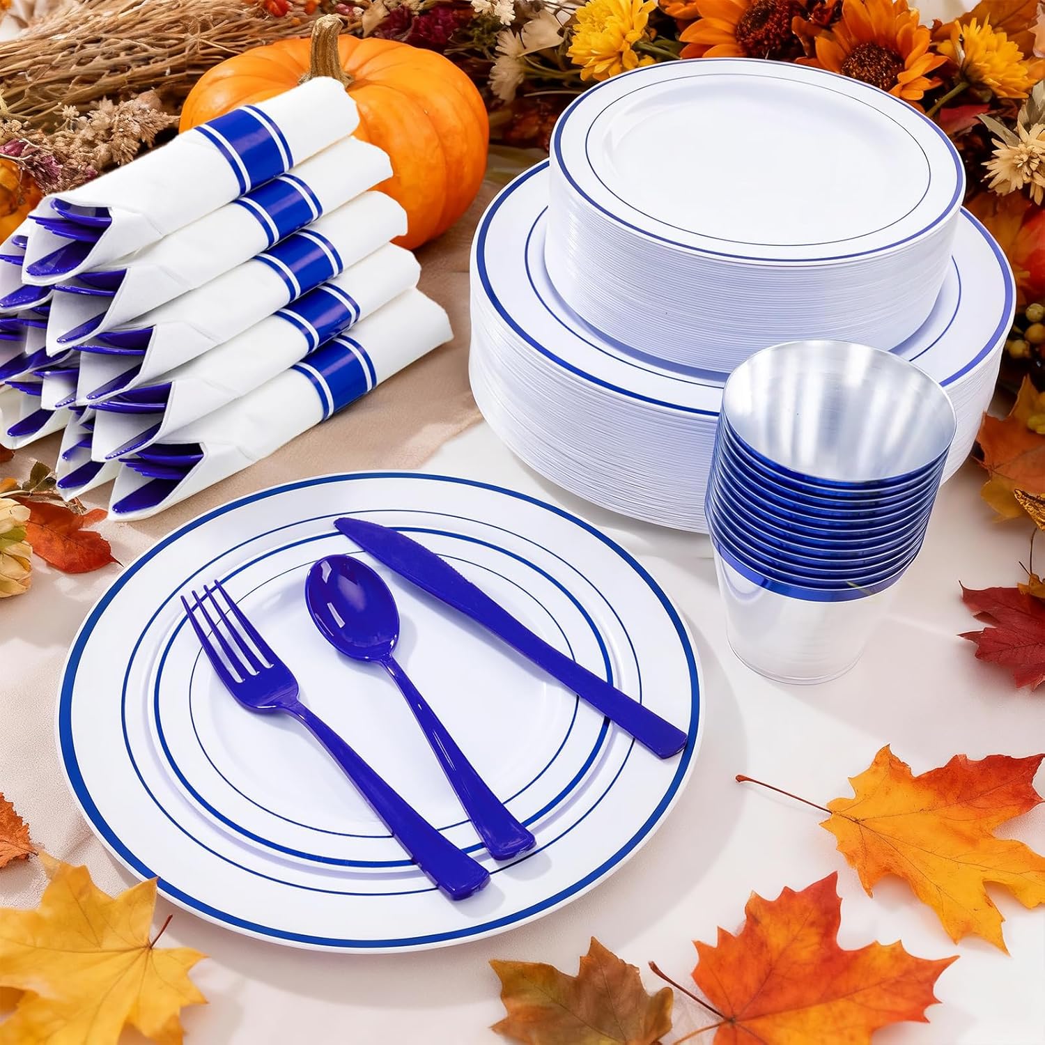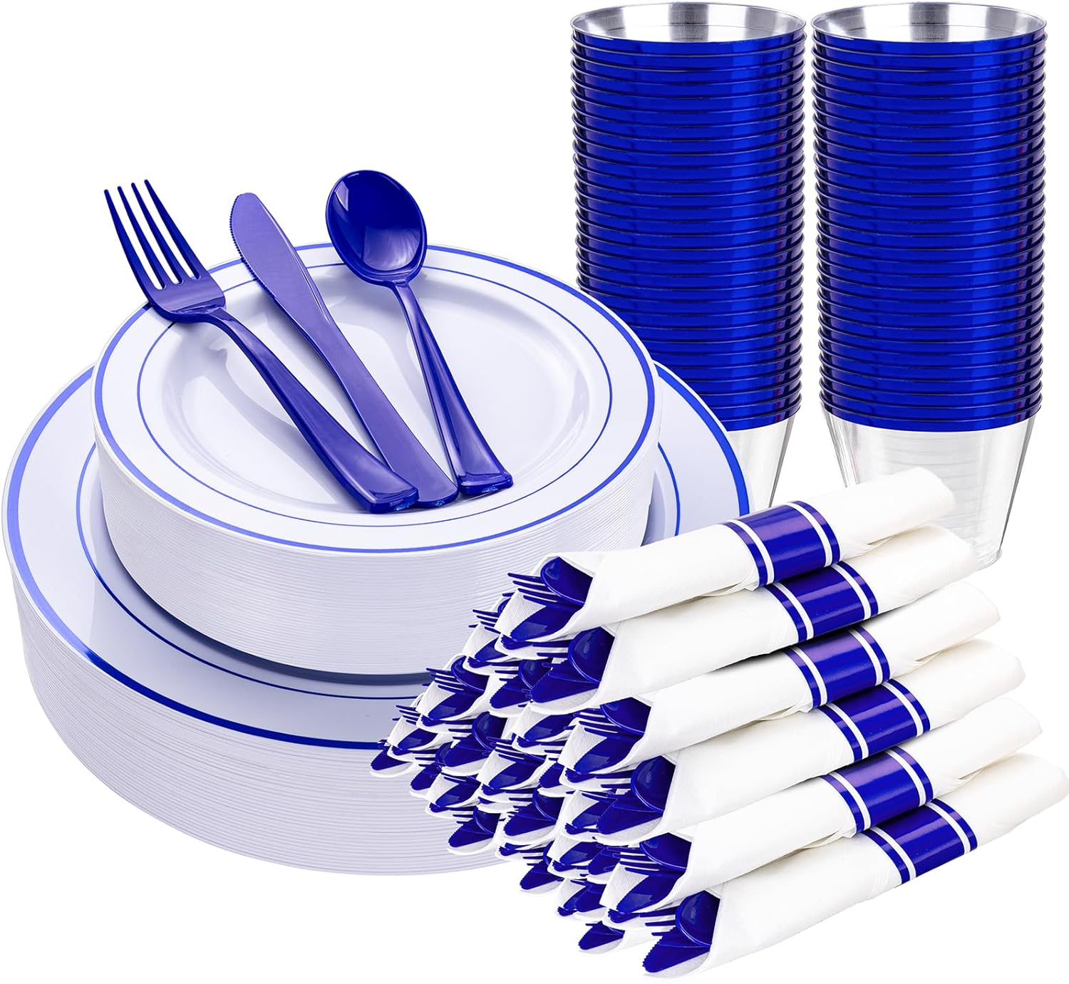 WELLIFE 210 Piece Blue Disposable Dinnerware Set,Plastic Plates for Party, Include: 30 Dinner Plates, 30 Dessert Plates, 30 Pre Rolled Napkins with Gold Silverware and 30 Gold Cups