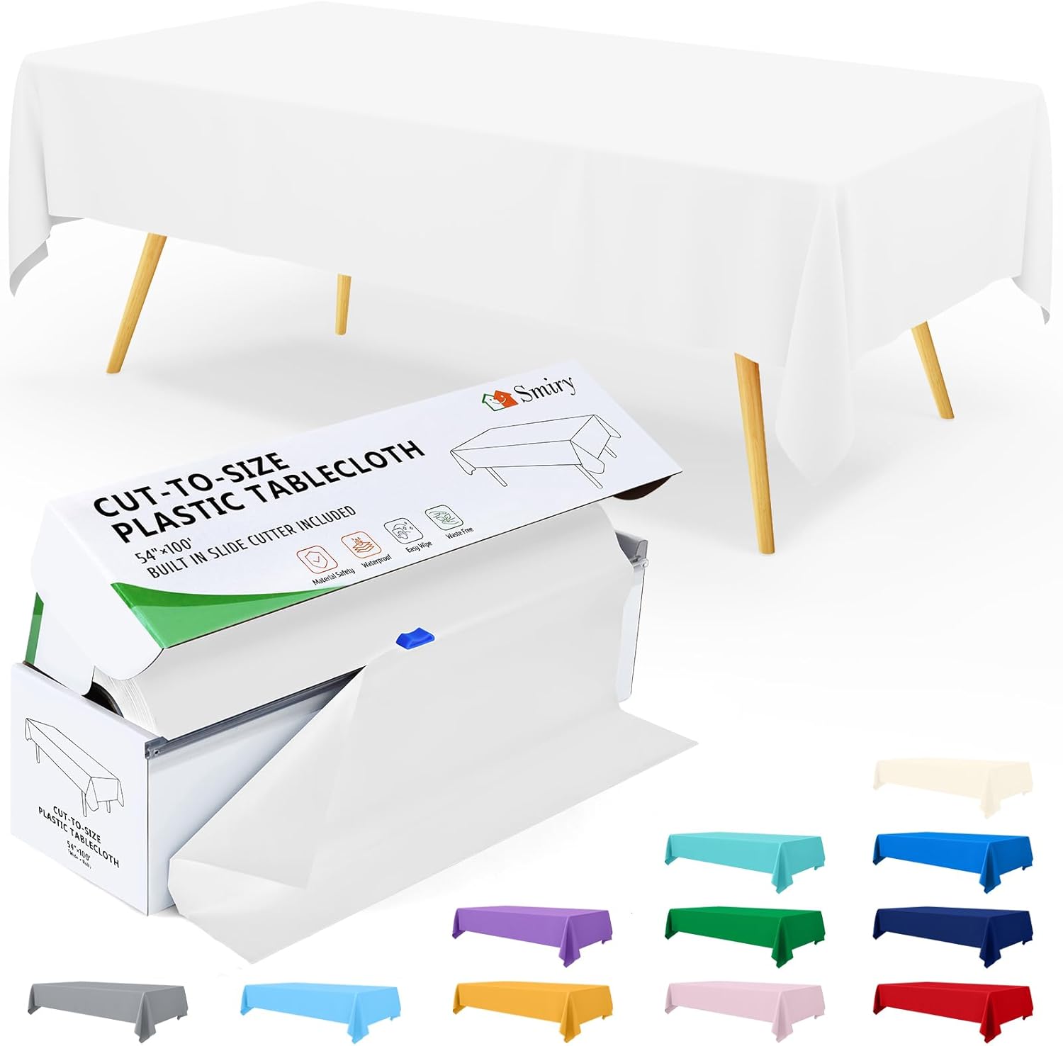 - [Easy Selection of Size with Sliding Cutter] This tablecloth roll comes in a handy box with cut-out tools that allow you to easily cut to the size you need. This plastic table cover roll is suitable match for rectangular, square, round or oval tables.