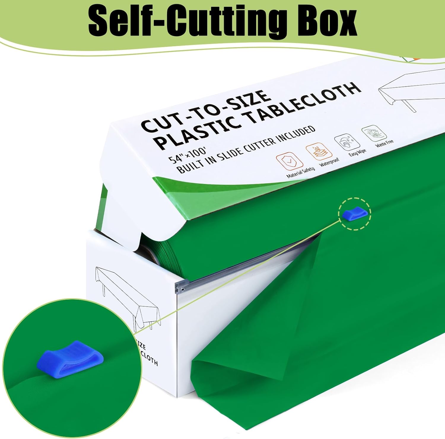 Smiry 54 Inch x 300 Feet Disposable Table Cover Roll, Green Plastic Table Cloth in Cut-to-Size Box with Slide Cutter, Waterproof Rectangle Tablecloths for Weddings, Banquets, Outdoor