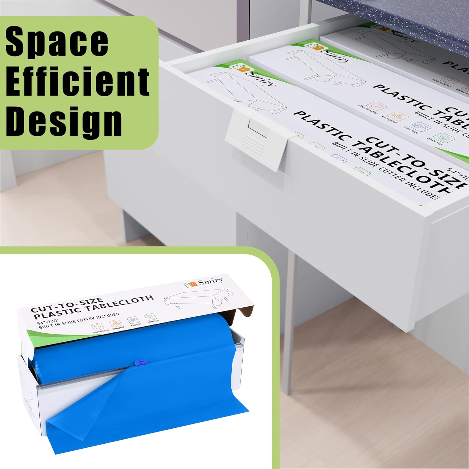 - [Easy Selection of Size with Sliding Cutter] This tablecloth roll comes in a handy box with cut-out tools that allow you to easily cut to the size you need. This plastic table cover roll is suitable match for rectangular, square, round or oval tables.