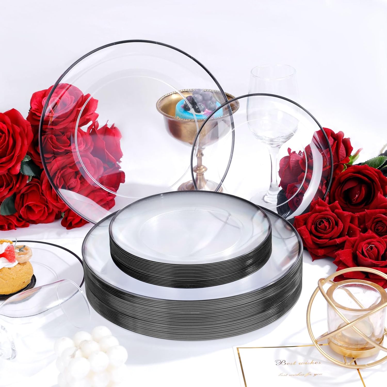 - 【Luxury Meets Convenience】Impress guests with LIYH black disposable plates—clear plastic plates with modern black rims that mimic high-end tableware.Perfect for wedding plates or plastic plates for party,the 120PC set (60+60) serves 60 guests effortlessly.Crystal clarity highlights desserts, while black plates disposable for party elevate tablescapes.Lightweight yet sturdy, they’re ideal for photo-worthy afternoon teas or hassle-free cleanup.Redefine “disposable” with plastic plates that look luxe but cost less!