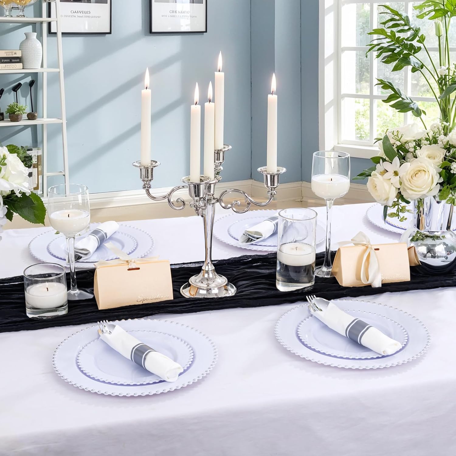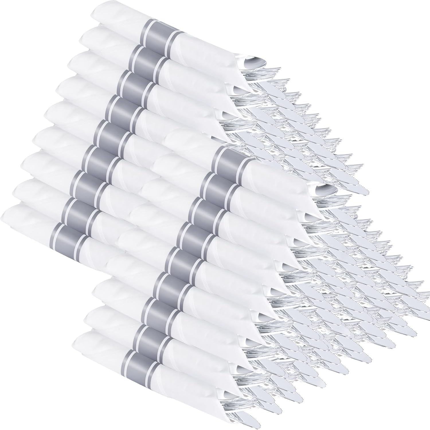 - Great Value Rolled Cutlery:These silver plastic silverware includes 100 silver plastic forks,100 silver plastic spoons,and 100 silver plastic knives,100 napkins.Whether it's a birthday party or a wedding,the plastic forks spoons and knives set with napkin is everything you need for a perfect mealtime experience.The plastic silverware set will totally make your guests happy at the party.
