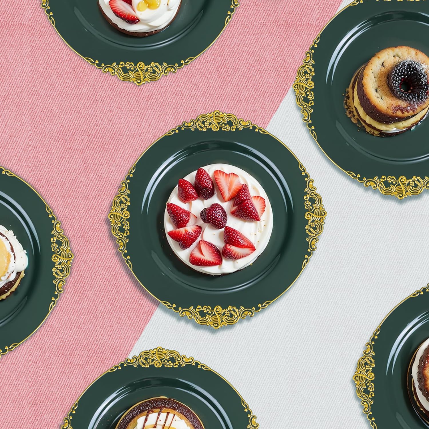 - Value Package: The Dark green plastic plates include 25 green dinner plates (10 inches) and 25 green dessert plates (7.25 inches), paired with 75 pieces of gold silverware disposable sets for a complete dining experience.