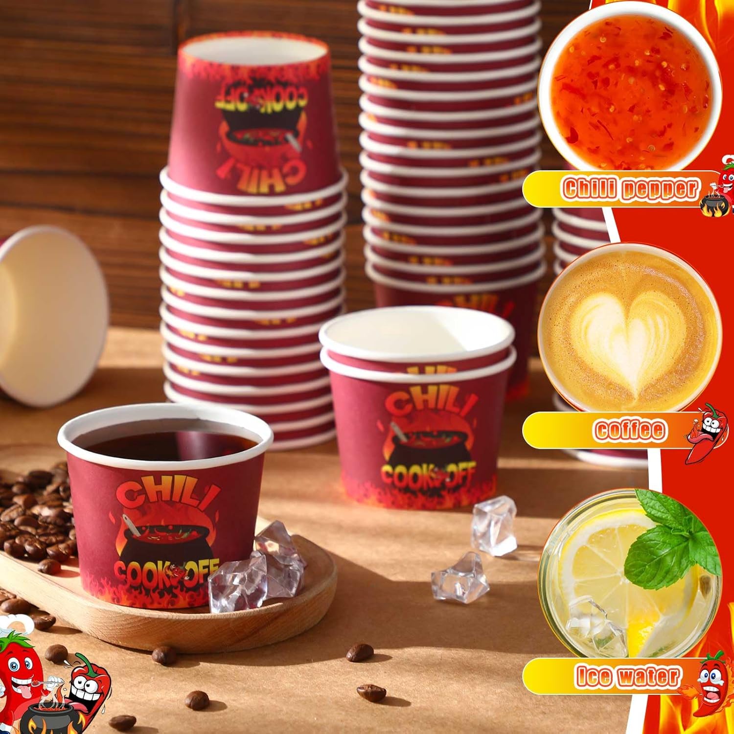 - Chili Fest Theme: make your celebration unforgettable with our chili cooking themed disposable cups; Our chili cooking paper cups feature vibrant chili peppers and dancing flames, adding an exciting and lively touch to your party's chili cook off party decorations; The innovative design and bright colors create a joyful party atmosphere, making them the nice decoration for chili cook off and an ideal party supplies for Cinco de Mayo