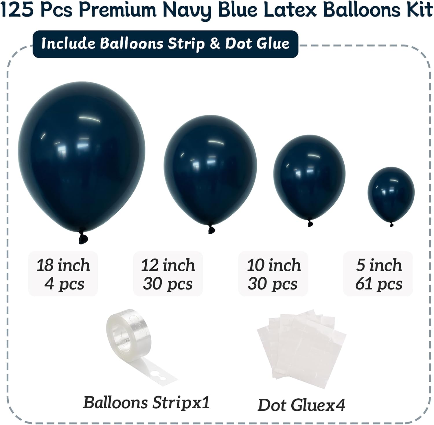- All-in-One Balloon Decorating Kit: Effortlessly create charming decor with 125 navy blue balloons different sizes: 4 pcs of 18 inch balloons, 30 pcs of 12 inch balloons, 30 pcs of 10 inch balloons, 61 pcs of 5 inch balloons. This kit includes glue dots and balloon tape strips for quick and easy assembly. Great for DIY or crafting stunning garland, columns, and centerpieces for any celebration.