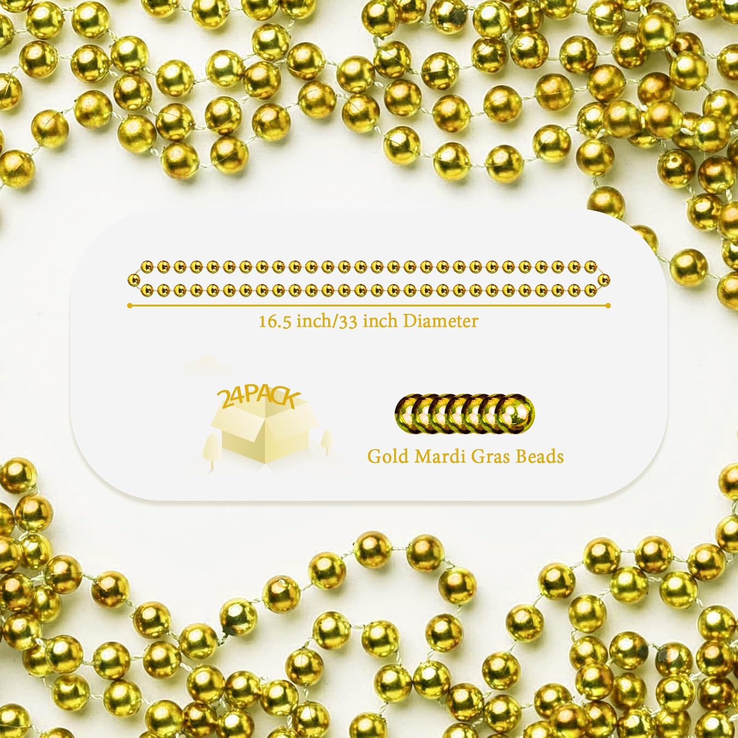 - 33'' Gold Beaded Necklace:Each Mardi Gras necklace is 33 inches long and its round beads design. The size of the party beads makes them suitable as wearable decorations