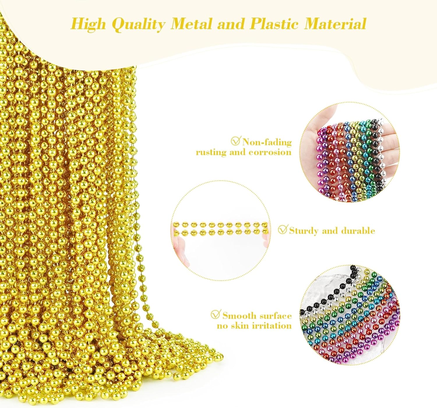 - Premium Quality: Gold Mardi Gras beads necklaces are made of sturdy and durable plastic material, do not break easily, non-fading, rusting and corrosion, round metallic beads have a smooth surface and are non-irritating to the skin, providing you with a comfortable wearing experience while you can use it for a long time