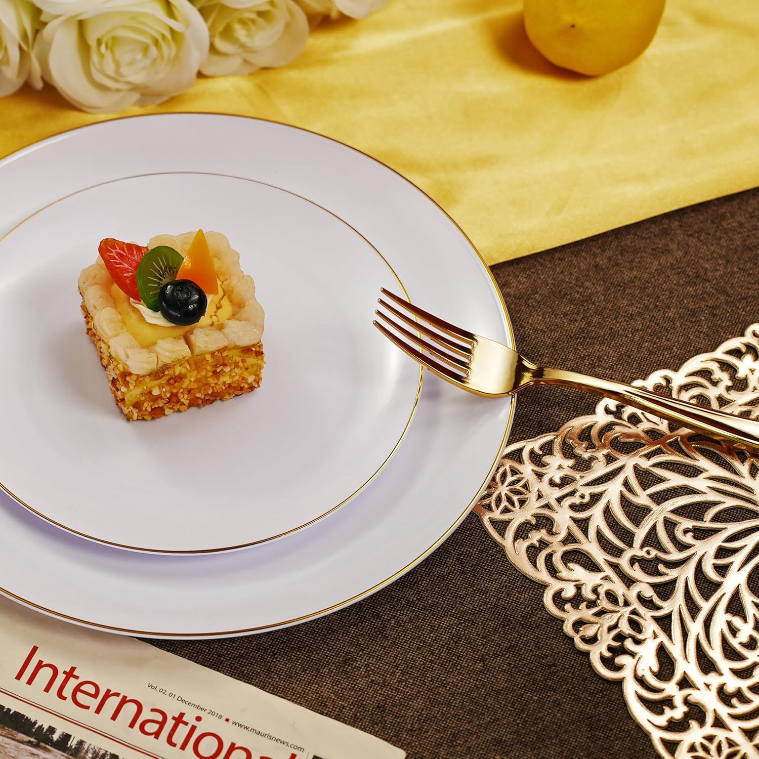 - YOU CAN GET:600PCS White and Gold Plastic Plates for 100 guests. Include:100 Gold Dinner Plates, 100 Gold Dessert Plates, 300 Gold Plastic Cutlery,100 Cups. It is great Party Supplies.