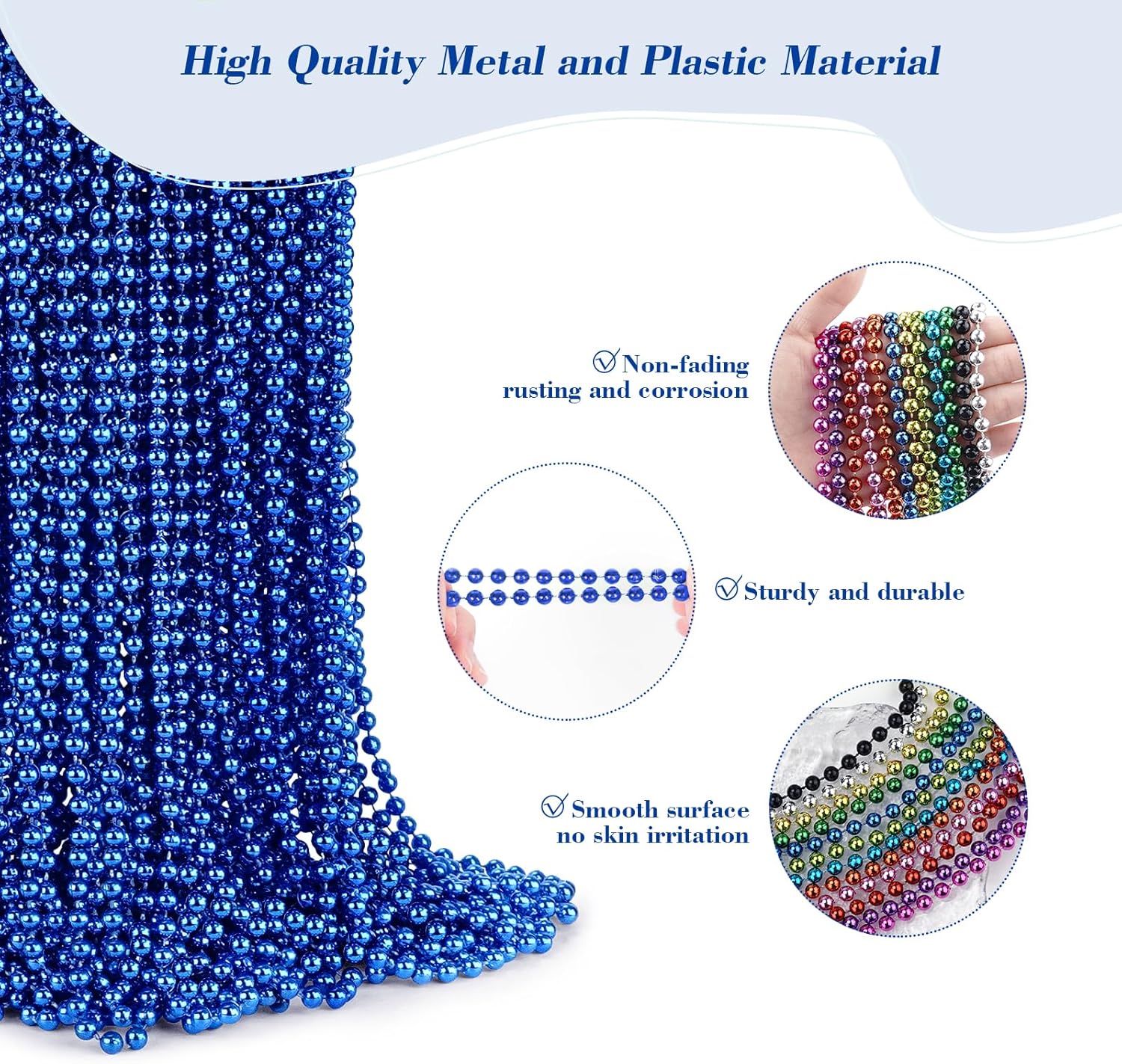 - Premium Quality: Blue Mardi Gras beads necklaces are made of sturdy and durable plastic material, do not break easily, non-fading, rusting and corrosion, round metallic beads have a smooth surface and are non-irritating to the skin, providing you with a comfortable wearing experience while you can use it for a long time