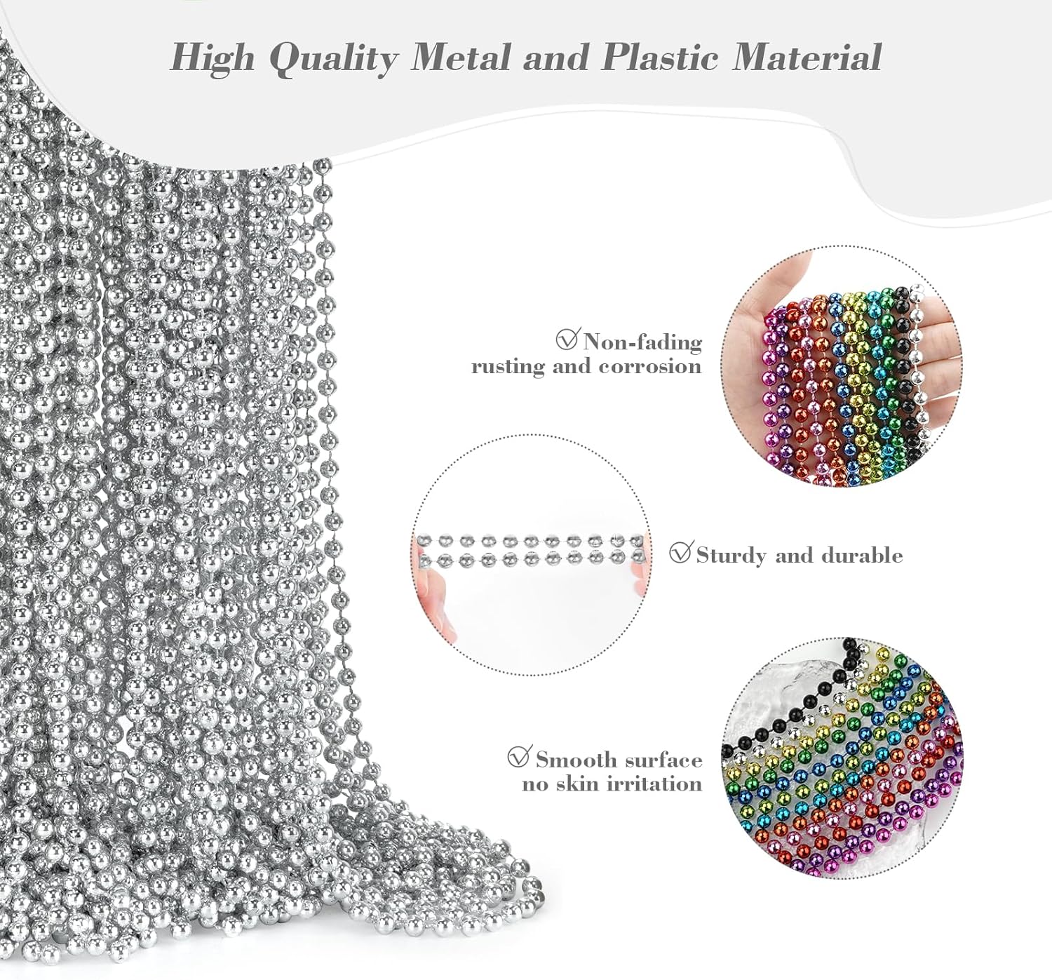 - Premium Quality: Silver Mardi Gras beads necklaces are made of sturdy and durable plastic material, do not break easily, non-fading, rusting and corrosion, round metallic beads have a smooth surface and are non-irritating to the skin, providing you with a comfortable wearing experience while you can use it for a long time