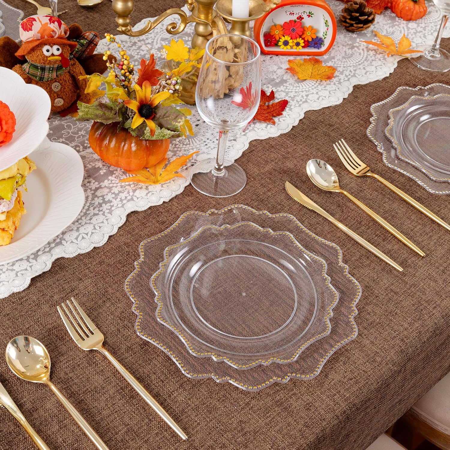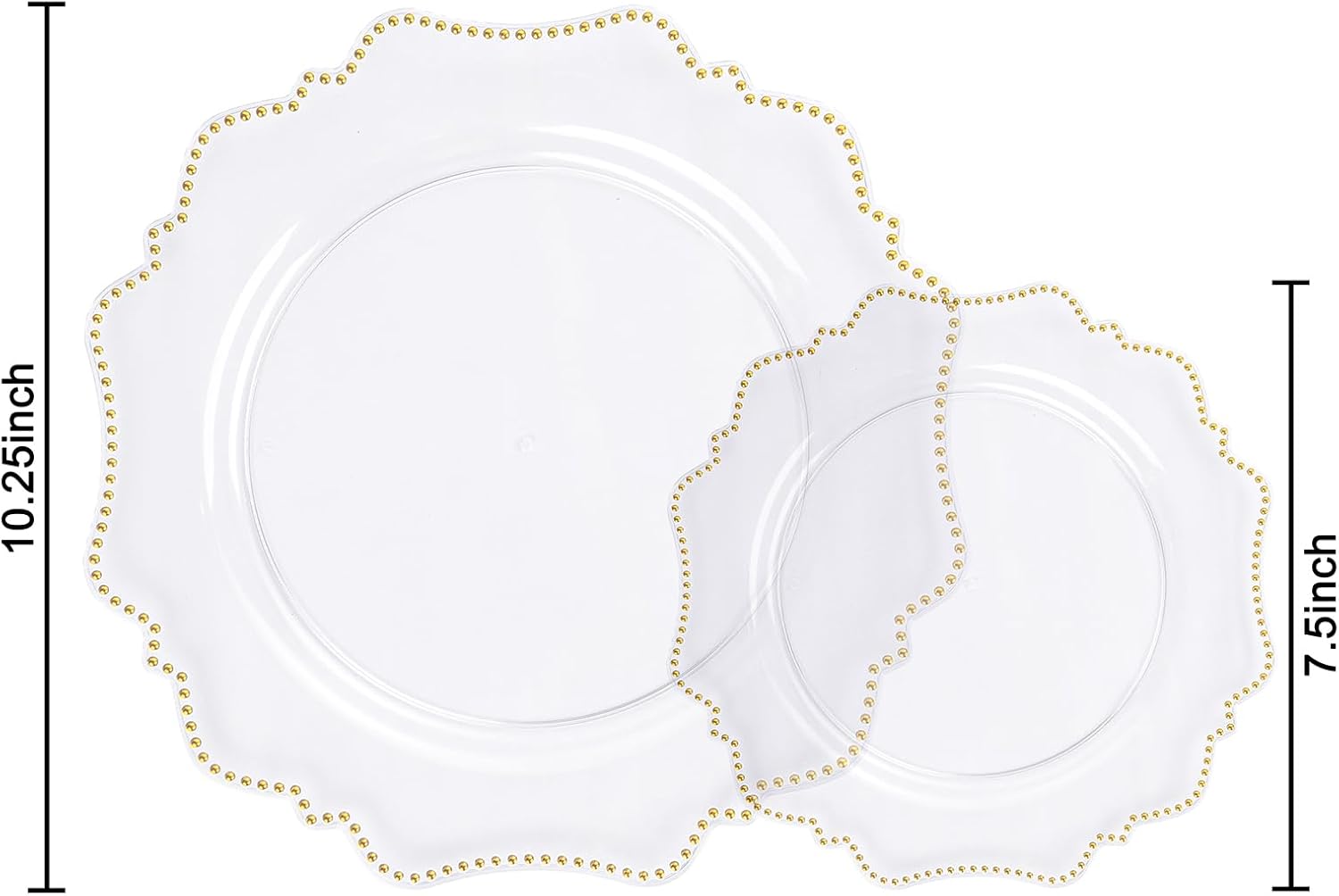 - 【100 PACKS PLASTIC PLATES】 Including 50 10.5" dinner plates and 50 8.25" dessert plates, which can serve 50 guests. Disposable Clear gold rim plastic plates make your party clean easy!