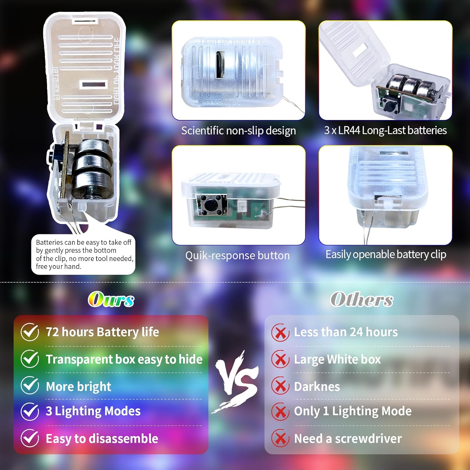 - PREMIUM QUALITY AND LONG LAST LIFE: 50 pack in a box, each twinkle lights made of high quality durable 7 feet long flexible silver wire, and 20 energy-efficient mini led fairy lights, 4 inch distance between each led moon lights. This fairy lights battery operated by 3 x LR44 batteries (included), which can provide 104 hours life. This Christmas lights is perfect for both everyday decorations as well as holiday decor (Batteries need to be replaced when the string get dims)