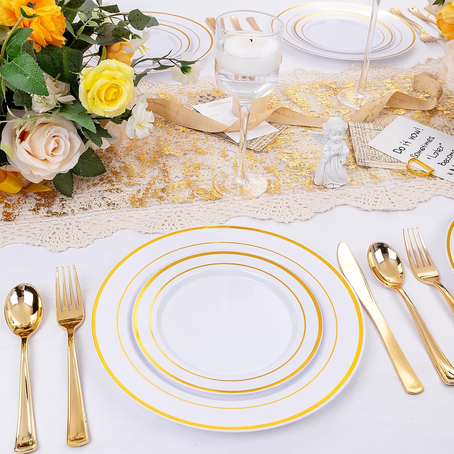 - ELEGANT DESIGN: Our gold disposable plates and gold utensils set are color-coordinated. The white plates with gold rim design gives this party plate an upscale, china-like look that will add a modern decorative touch to your table. Their elegant appearance can meet the aesthetic requirements of all people, and the gold plates can be used for any occasion.