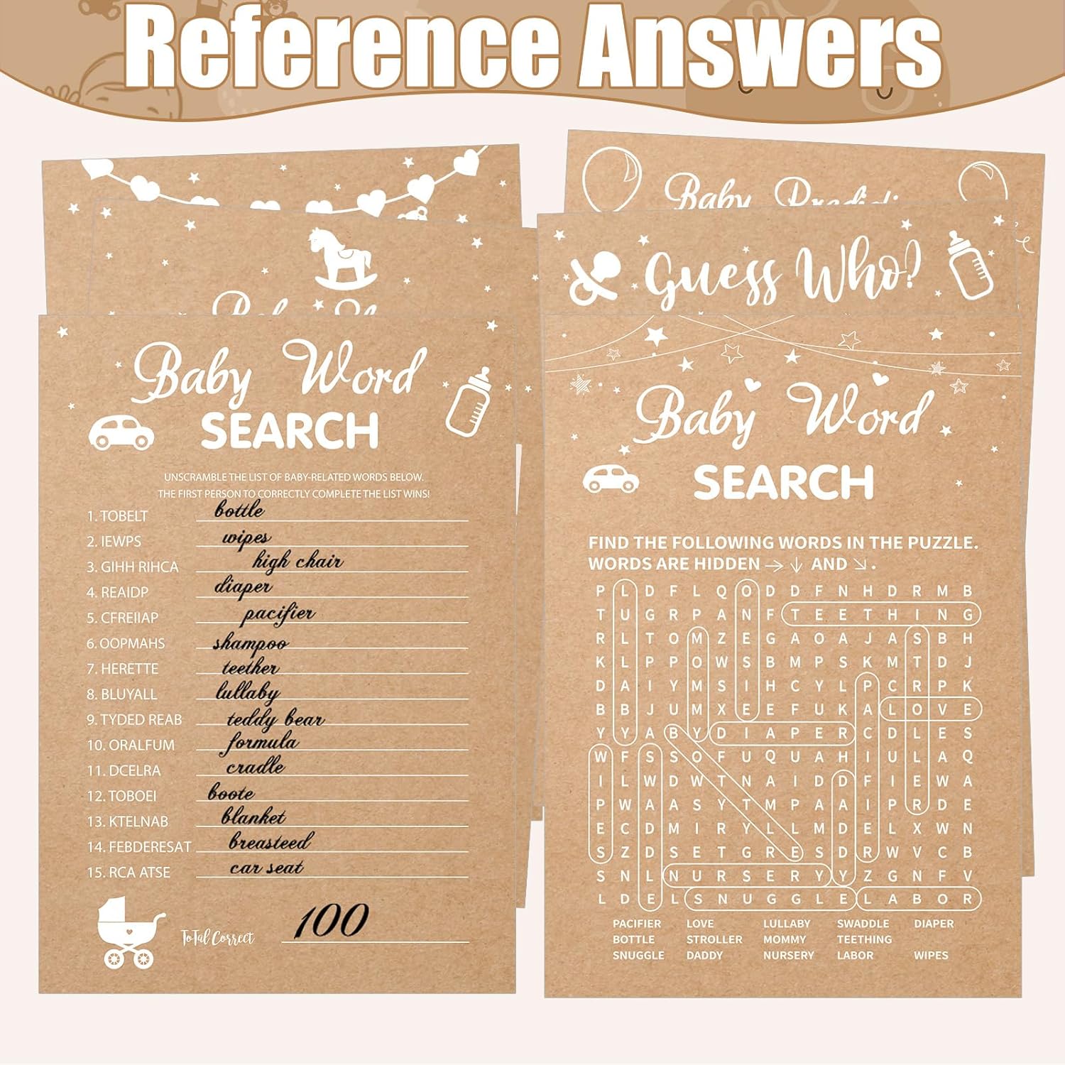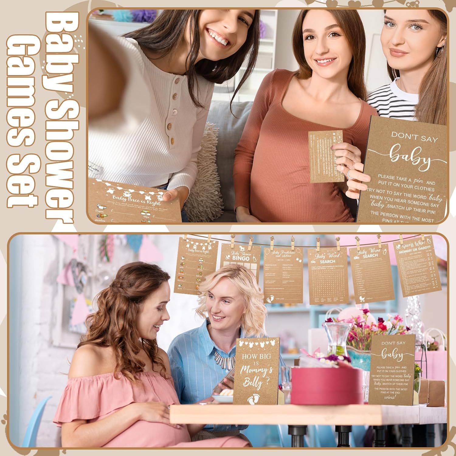 - Kraft Baby Shower Games Complete Set: Kraft baby shower decorations includes 8 sets of Kraft theme games for baby showers in the package (each set includes 50 cards; A total of 300 cards and 20 pencils), 1 set of measure the belly baby shower game (including 1 piece of how big is mommy's belly sign, 50 pieces of guessing cards and 2 rolls of measuring tapes), and 1 set of don't say baby shower game supplies (including 1 piece of wooden don't say baby sign, 50 pieces of wooden clothespins)