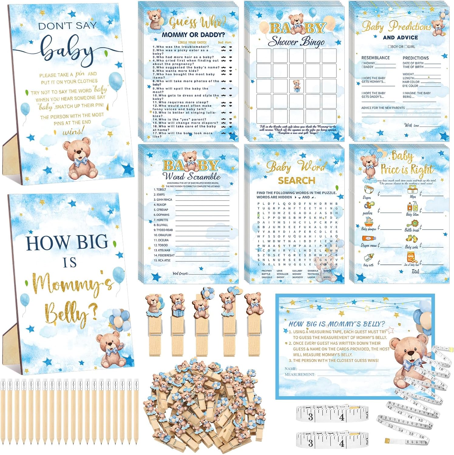 - Bear Baby Shower Games Complete Set: bear baby shower decorations includes 8 sets of bear theme games for baby showers in the package (each set includes 50 cards; A total of 300 cards and 20 pencils), 1 set of measure the belly baby shower game (including 1 piece of how big is mommy's belly sign, 50 pieces of guessing cards and 2 rolls of measuring tapes), and 1 set of don't say baby shower game supplies (including 1 piece of wooden don't say baby sign, 50 pieces of wooden clothespins)