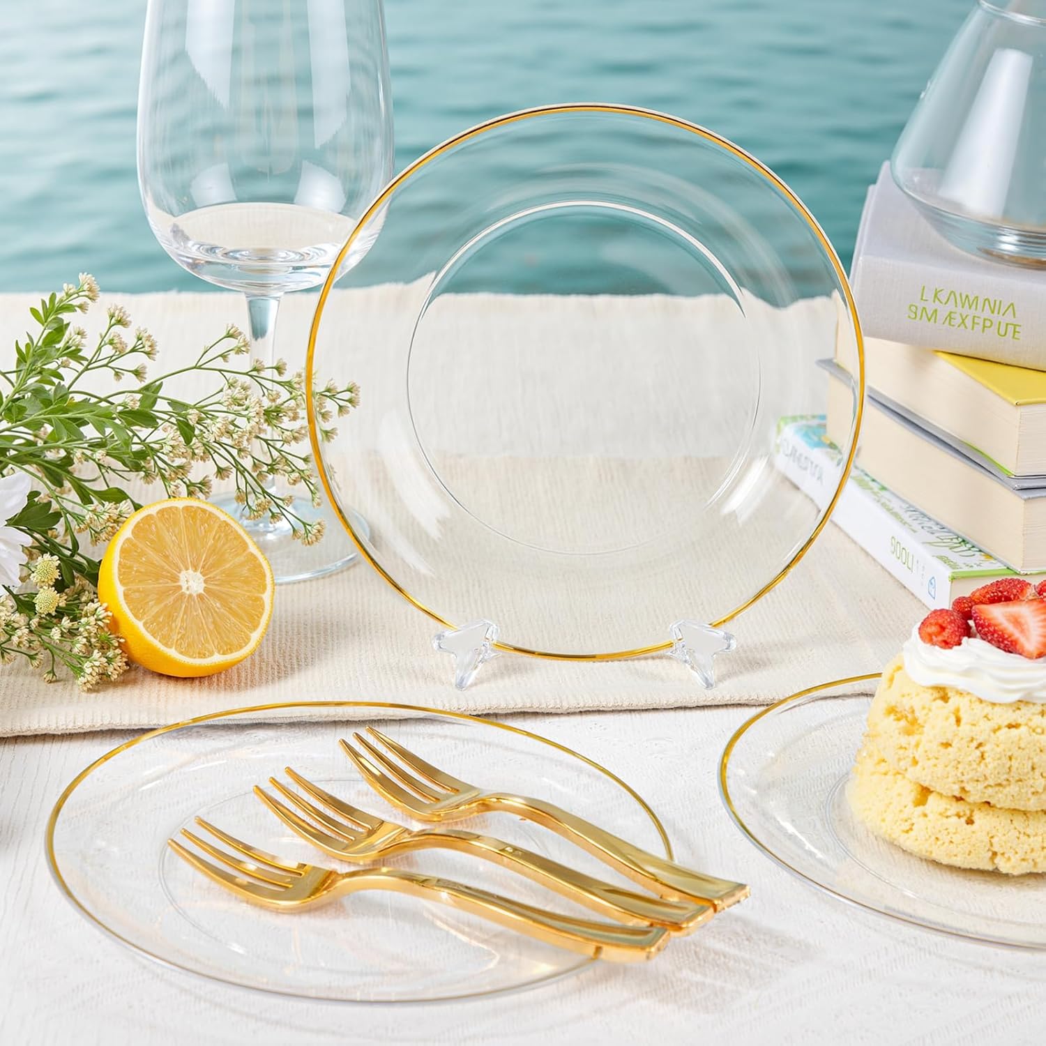 - STYLISH TRANSPARENCY MEETS GOLD GLAM:Our clear plates with gold rim blend modern chic and timeless luxury and gold small forks. Whether for a sleek rooftop soiree or a laid-back patio party, the clear dessert plates elevate every meal with effortless elegance.