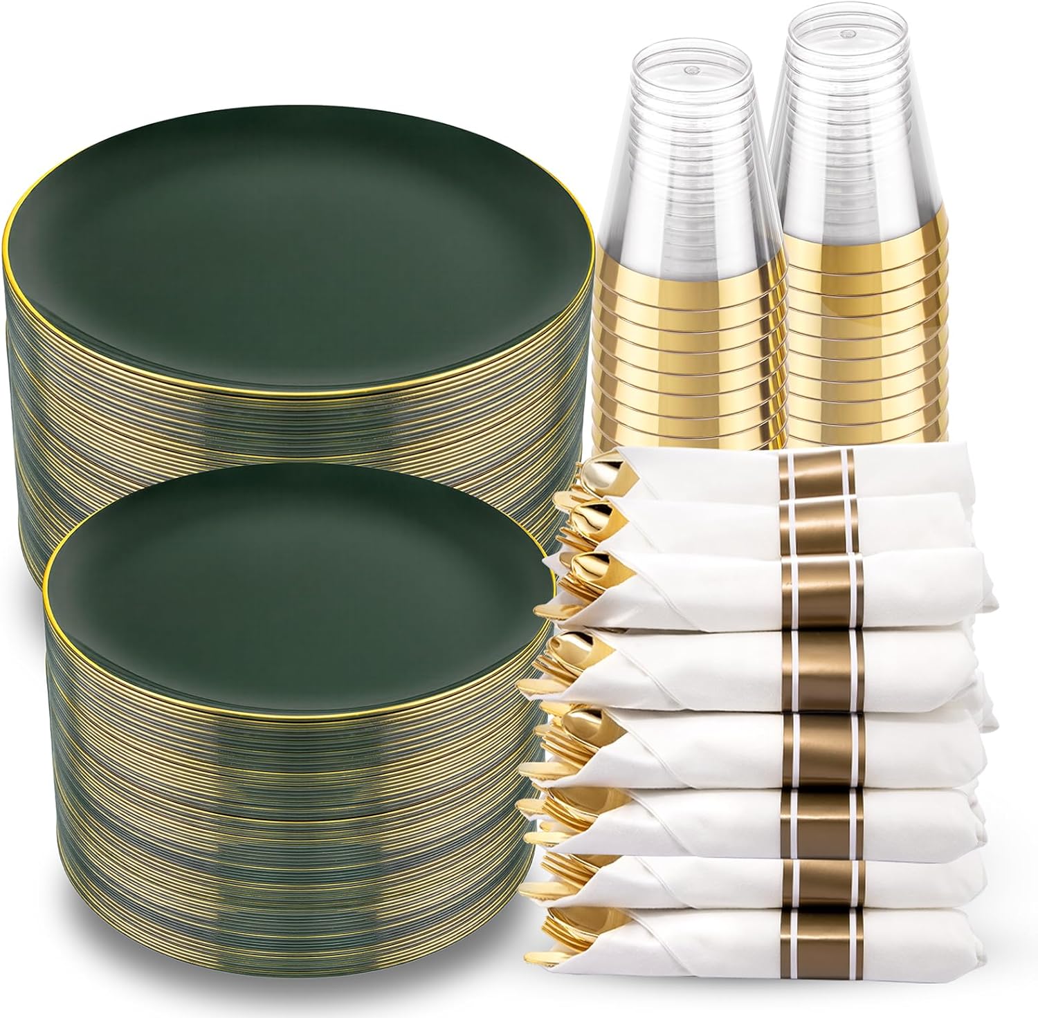 - Sufficient Quantity - These green plastic plates includes 50pcs 10-inch green dinner plates, 50pcs 7-inch dessert plates, 50pcs cups, 50pcs rolls of napkins, 50pcs knives, 50pcs forks, and 50pcs spoons, suitable for 50 guests